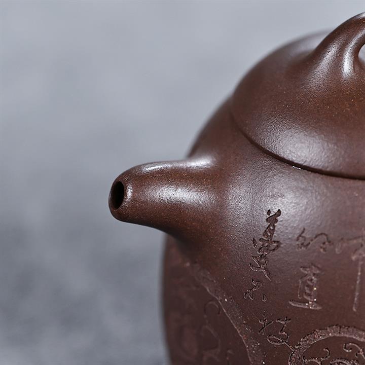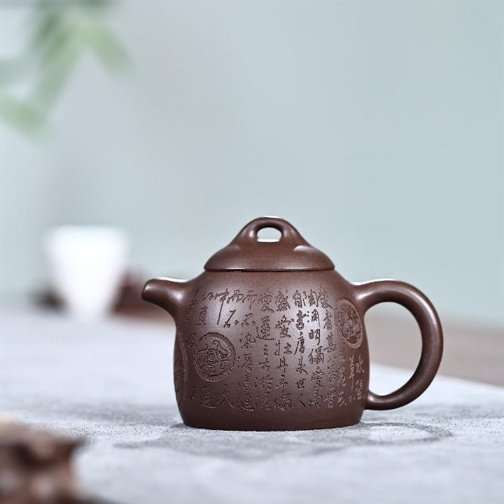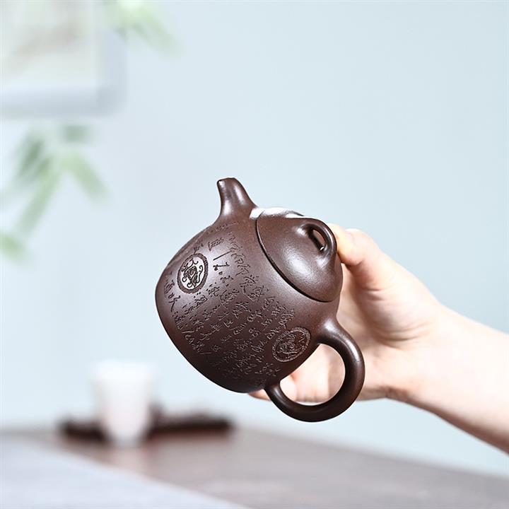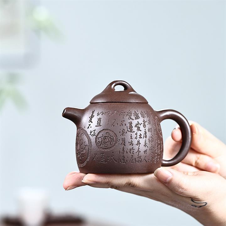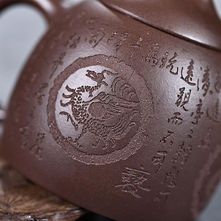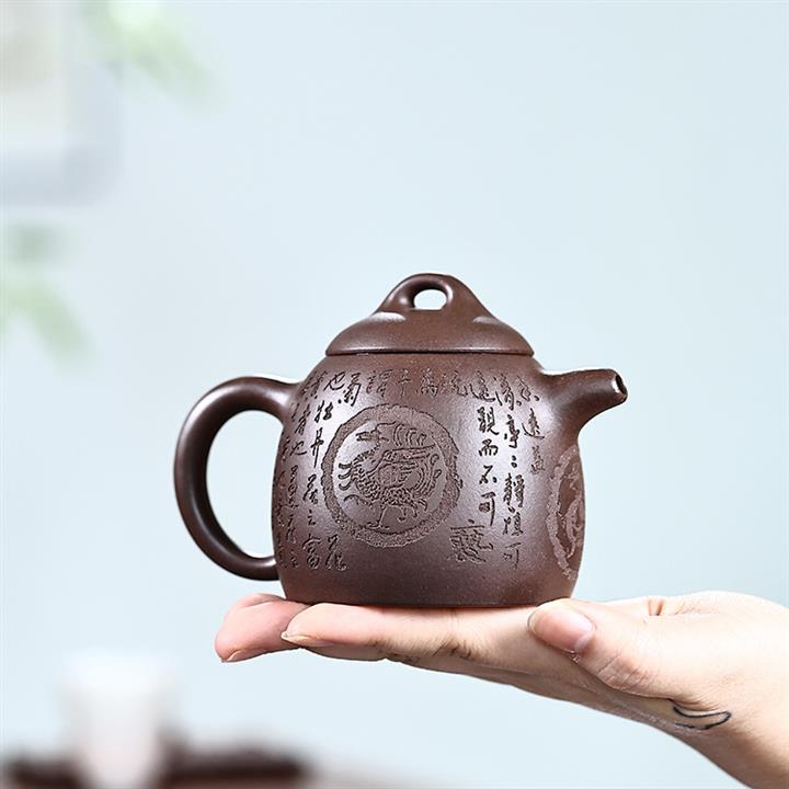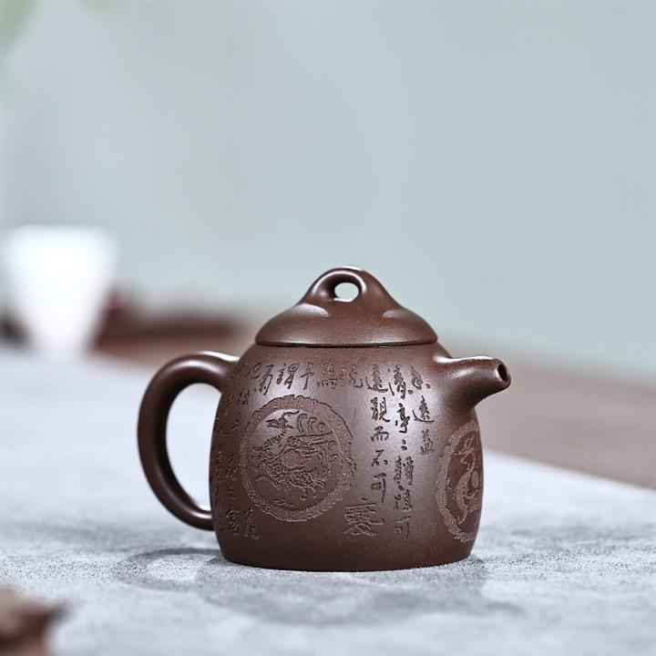 【介紹】此壺名為秦權壺,是紫砂壺中的經典款型。該壺比例協調,器型小巧,壺身刻字雕龍,出水流暢,泥料透氣性好,容易泡養,配證書,送壺繩,禮品盒包裝。