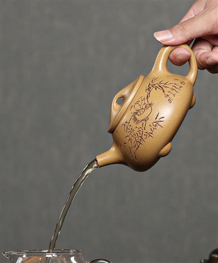 【簡介】石瓢壺,壺身呈八字造型,豐潤飽滿,曲線柔和流暢,平壓蓋、橋鈕,拿取自如,直流簡而有力,出水順暢,壺把上豐下斂,與壺身之型形成和諧的美學效果,底部三足給人以輕靈而穩重之感。整器比例精湛,骨肉亭勻,氣韻充沛,是一把非常實用的品茶利器。