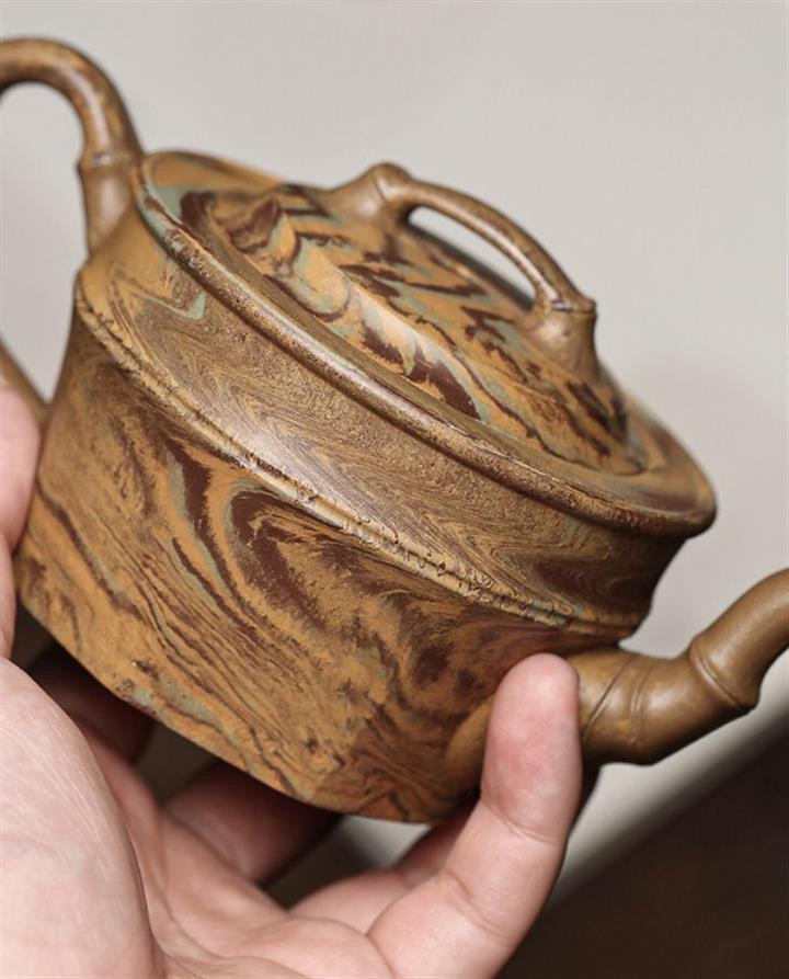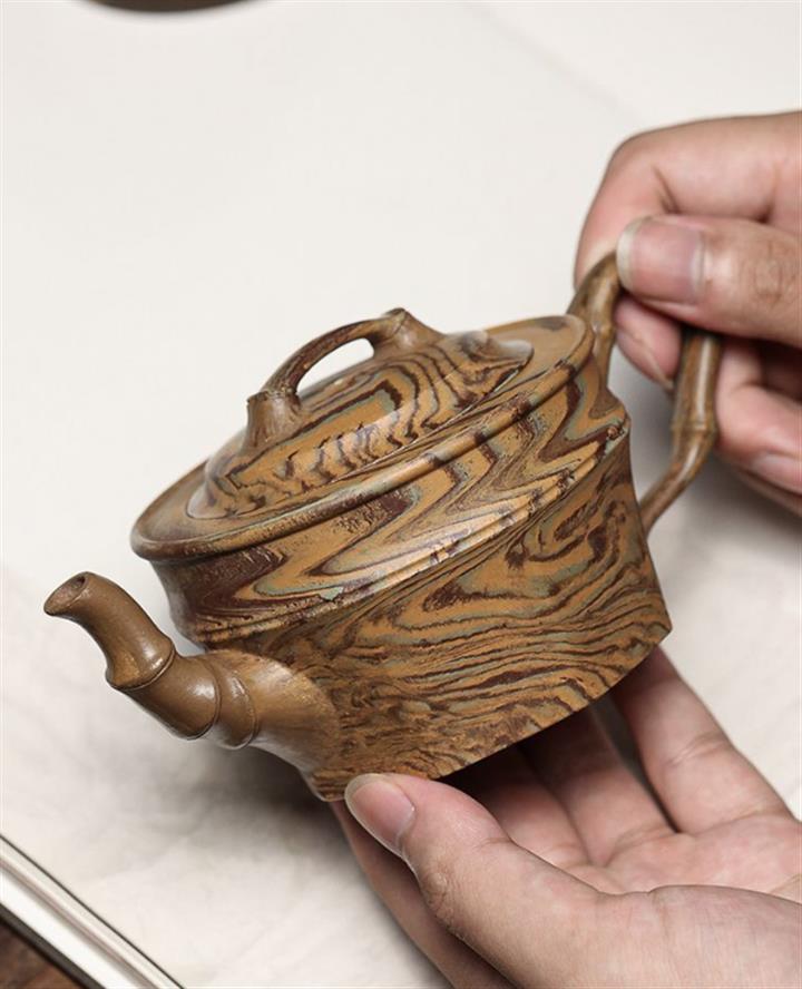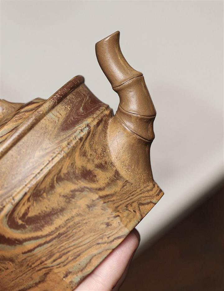 【簡介】壺身采用絞泥製作,壺身直而粗壯,上圓下方,壺嘴、壺鈕、壺把均以竹段造型,清秀自然,挺拔高雅,竹以清高著稱,壺更有雅潔之態,整器比例精湛,骨肉亭勻,氣韻充沛,是一把非常實用的品茶利器。