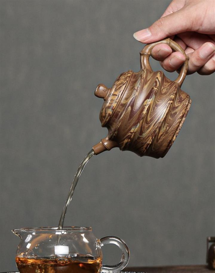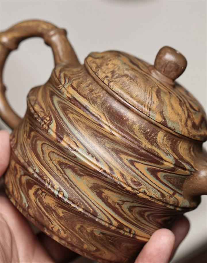 【簡介】壺身采用絞泥製作,壺身為圓潤的高身筒,綿密均勻的竹節造型,蒼勁有節,幹脆利落;壺身、壺嘴、壺把全以竹段、竹節自然天成,且竹節的造型古拙疏瘦,老味十足,藝術氣息,整器比例精湛,骨肉亭勻,氣韻充沛,是一把非常實用的品茶利器。