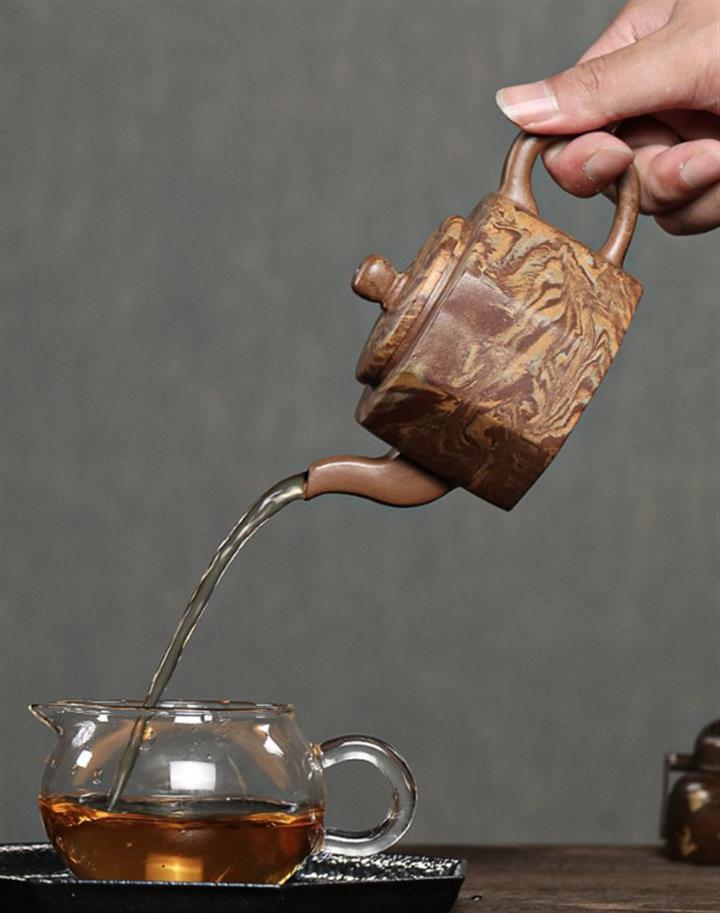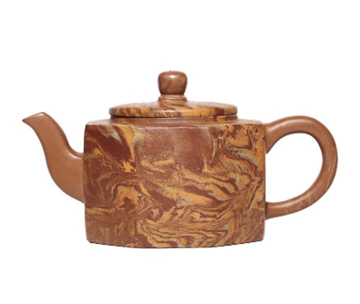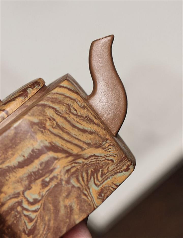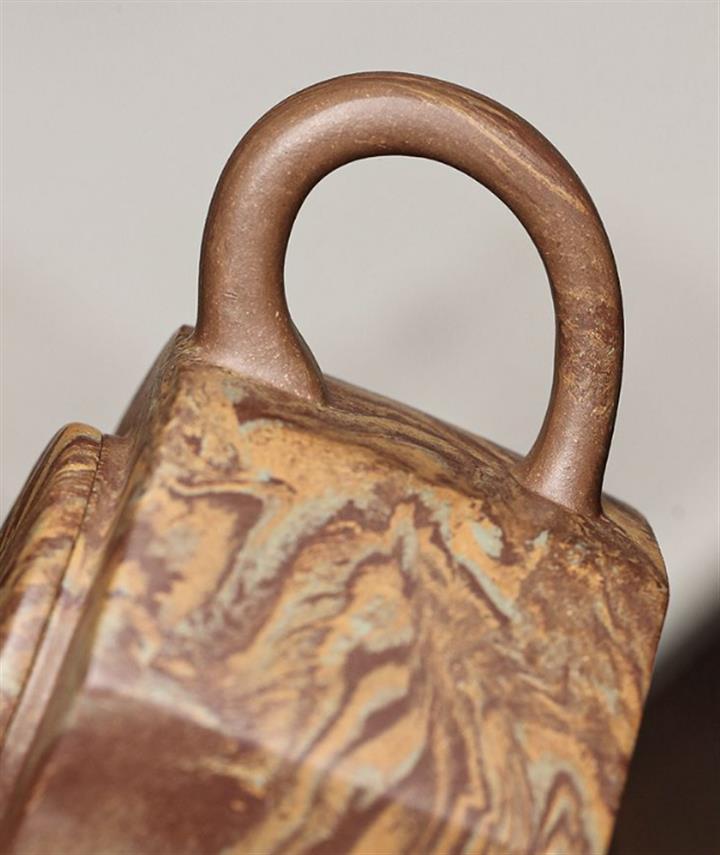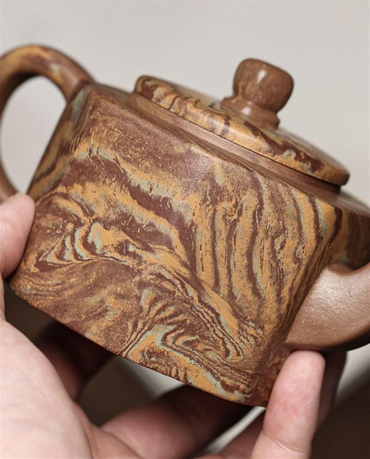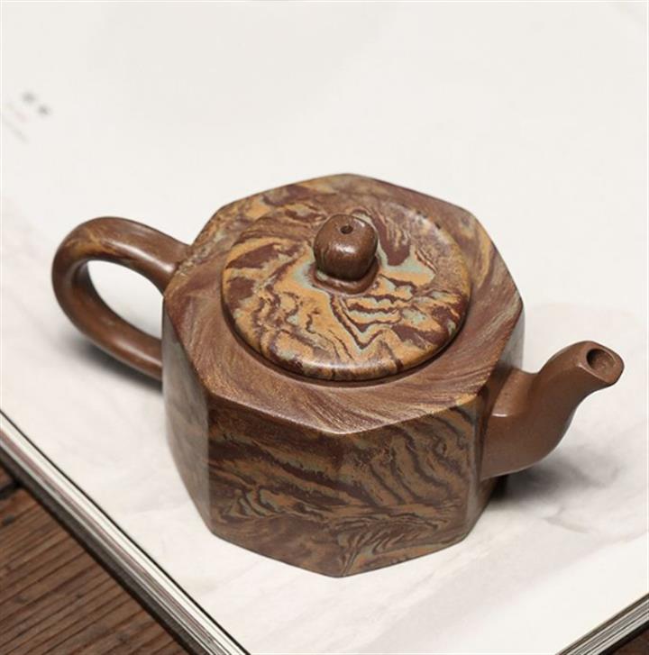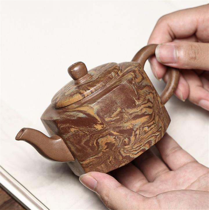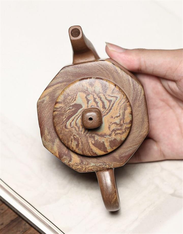 【簡介】壺身采用絞泥製作,此壺器形端莊,壺身為八方而成,蓋沿圈線細膩流利,口蓋嚴絲合縫,直流見剛強。壺身八面絞泥紋理猶如風起雲湧一般雄渾大氣,令人著迷,整個器型線條明朗有節奏,擁有陽剛之氣,更顯正直凜然之風。整器比例精湛,骨肉亭勻,氣韻充沛,是一把非常實用的品茶利器。