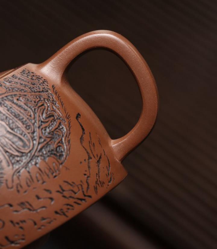 【簡介】此壺形製精巧,器型敦厚,製工細致連貫流暢。嵌蓋,橋形鈕,短流粗壯可愛,耳形把裝飾,趣味十足。壺底與壺蓋均作瓦當形製,製式精妙。壺身刻繪裝飾,將老虎的霸氣,威震八方,融於紫砂壺中,文人氣韻深厚,是為一把經典的文人壺作品,值得收藏