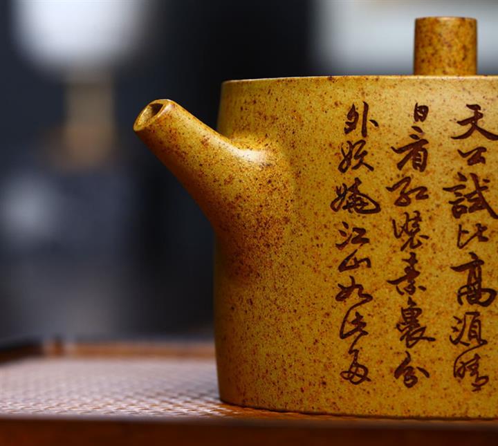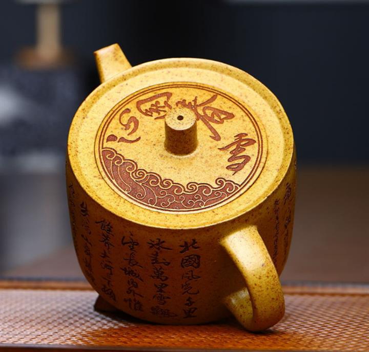 【簡介】此壺,承襲傳統古法匠心手製,外形設計頗有靈感,百道工序,方可成型。紫砂顆粒清晰可見,壺蓋內卡蓋設計,嚴絲合縫,柱型壺鈕,拿捏舒適便捷,大口徑設計,投茶方便,得心應手,出水順暢,滴水不漏,壺身手刻,方顯刀尖上的藝術,通身刻繪《沁園春.雪》文字瀟灑倜儻,氣勢磅礴,字裏行間透露出一代偉人的戰略風采。耳形壺把,做工精細,拿捏舒適,壺嘴造型幹練,出水順暢。你,值得擁有