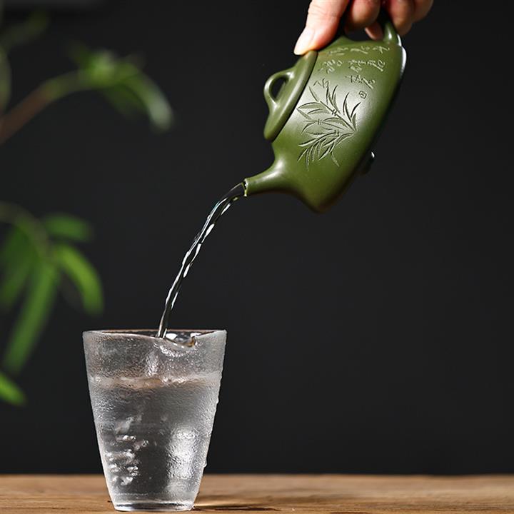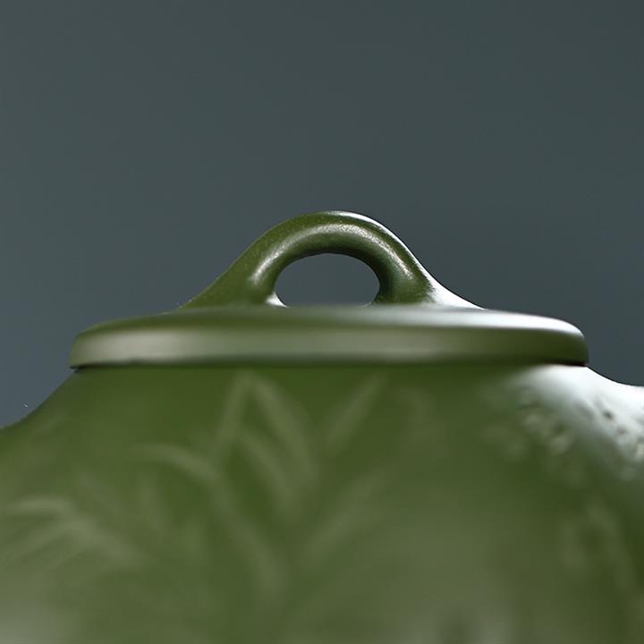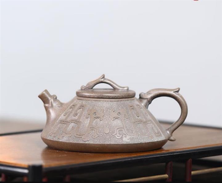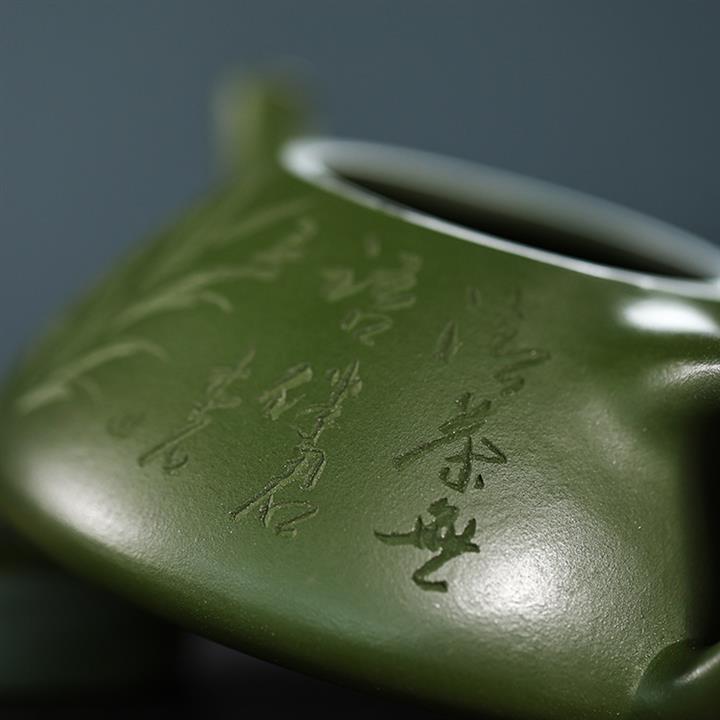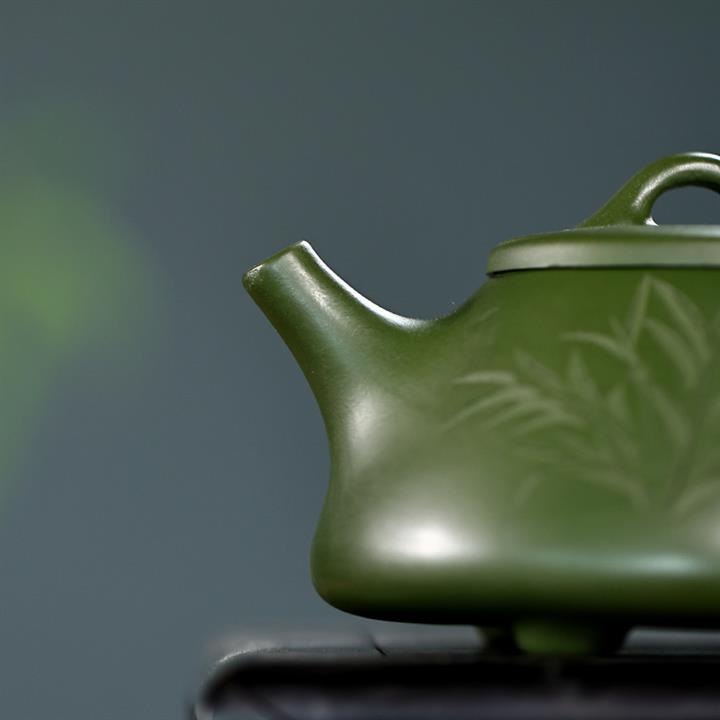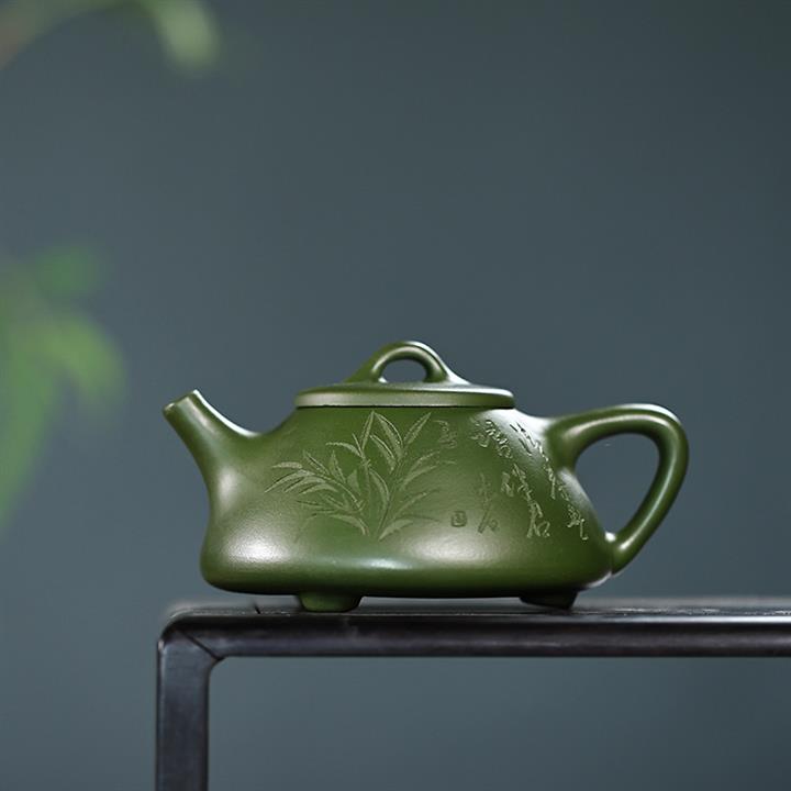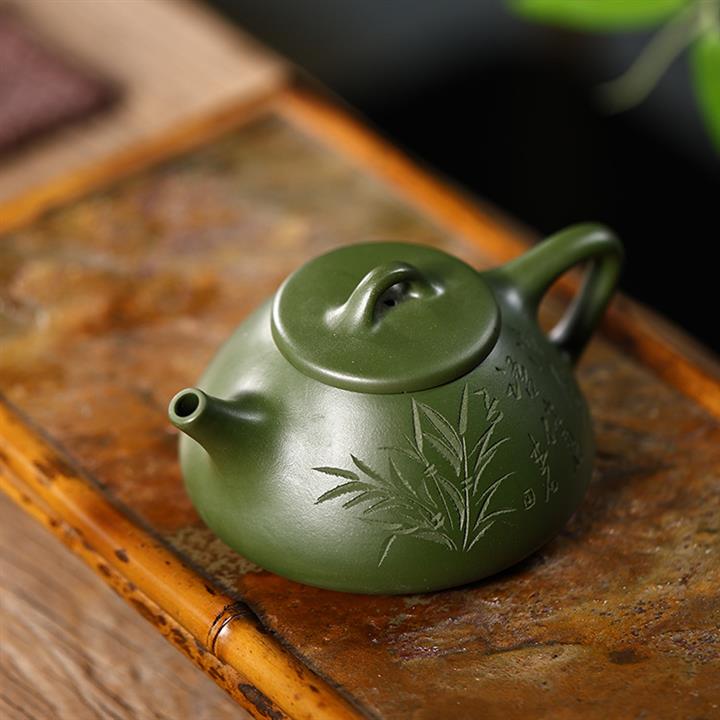 【介紹】此壺名為子冶石瓢壺,是紫砂壺中的經典款型。該壺比例協調,器型挺直,壺身手工刻竹,出水流暢,泥料光滑,配證書,送壺繩,禮品盒包裝。