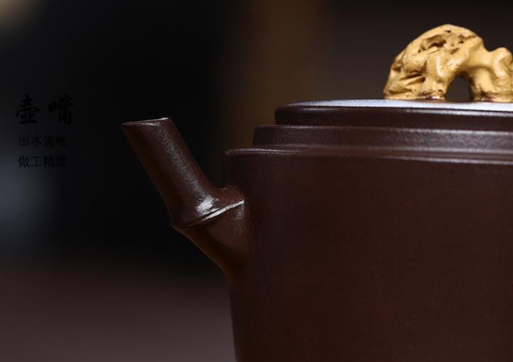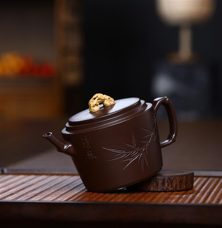 初觀此壺,幕傳傳統紫砂形制,卻又生成具有的造型美感,型體取竹節 高雅秀美 根基穩固 寓意吉祥 手工刻竹葉 富有張力 壺蓋大湖石裝飾 細節處理靈動自然 文人雅器 值得把玩!