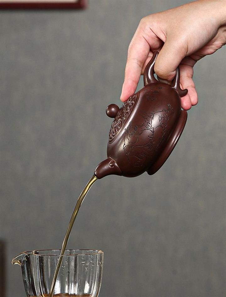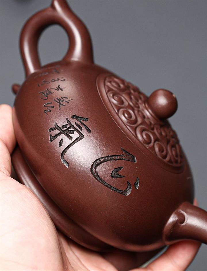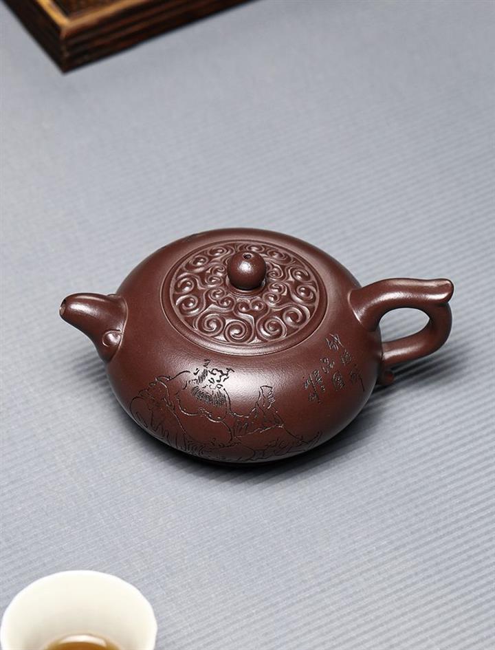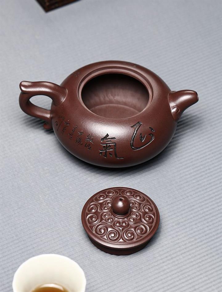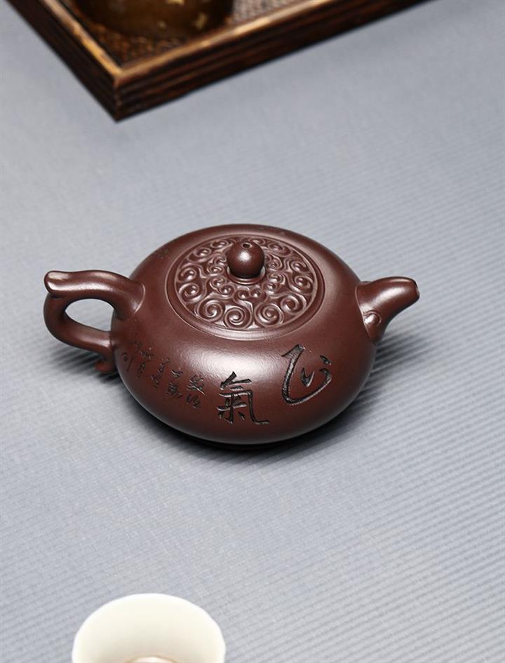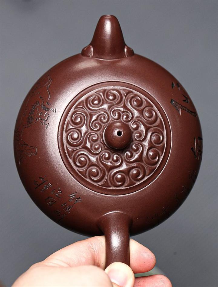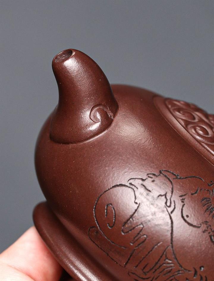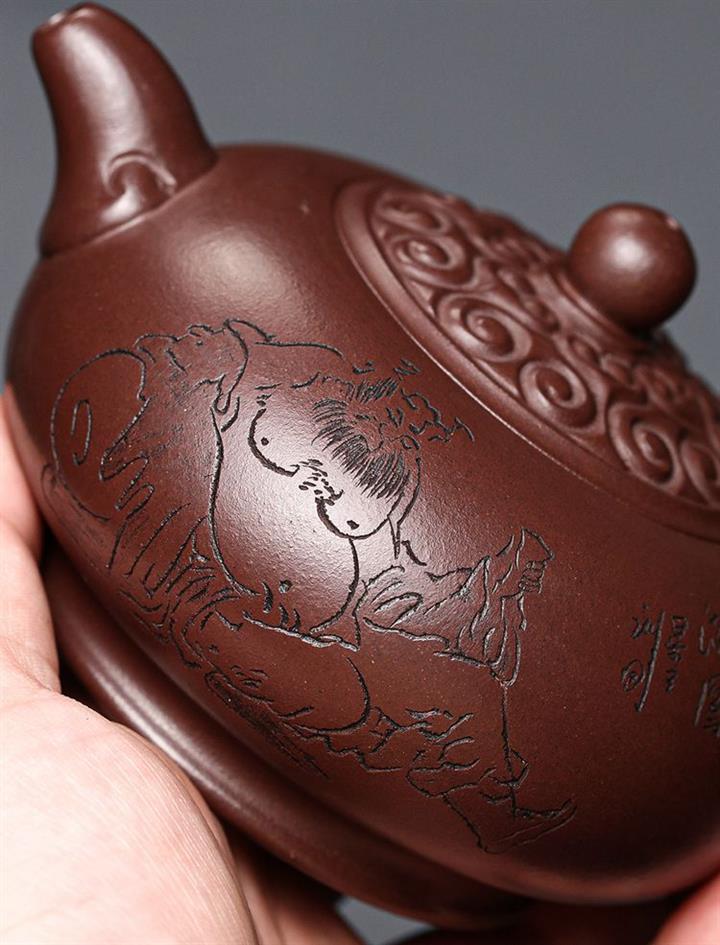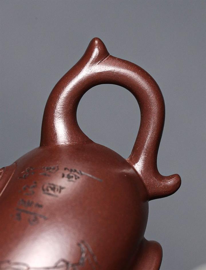 【介紹】此壺制作稍扁,自然其制作工藝難度自然也比較的大。壺蓋壓蓋和壺口嚴密結合,弧度齊整;如意裝飾壺蓋,壺體端莊古樸,線條優美流暢; 如意壺嘴彎流,出水好,壺身的刻繪更是增添此壺的藝術效果與欣賞效果
