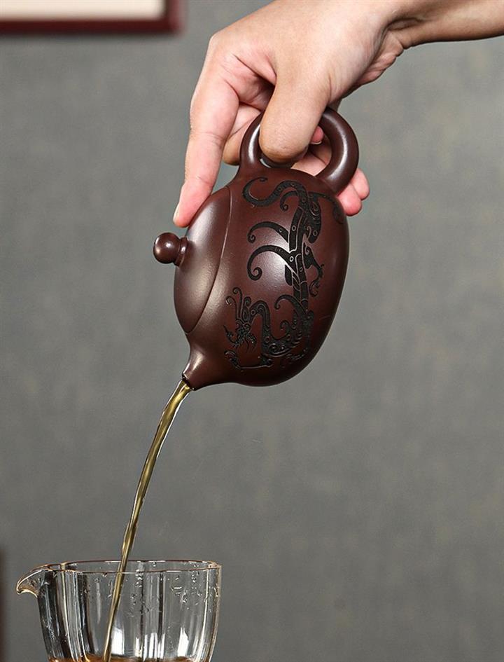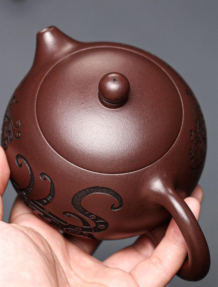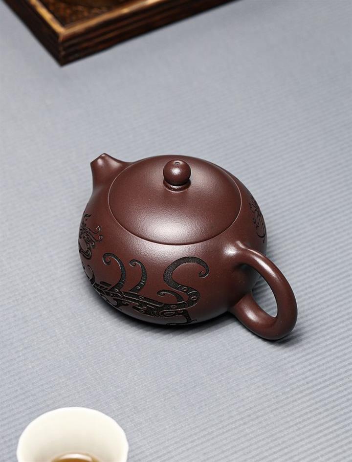 【介紹】大容量西施壺,傳統器型,泥質細膩,色澤美豔動人,光韻流轉之間見光滑的膚質,甚是迷人。圓潤的壺身,壺身雙面刻繪裝飾,圓溜溜的壺鈕,短短的翹嘴,直爽中透露出幾分嬌憨,甚是迷人。倒把下沈,把底與壺嘴兩兩相望,意蘊悠長