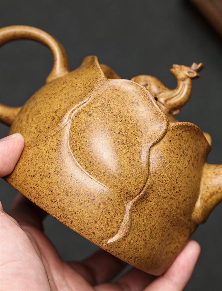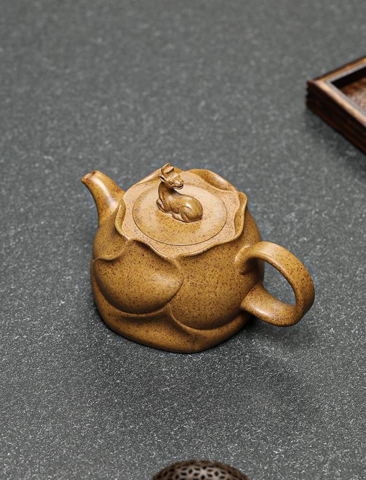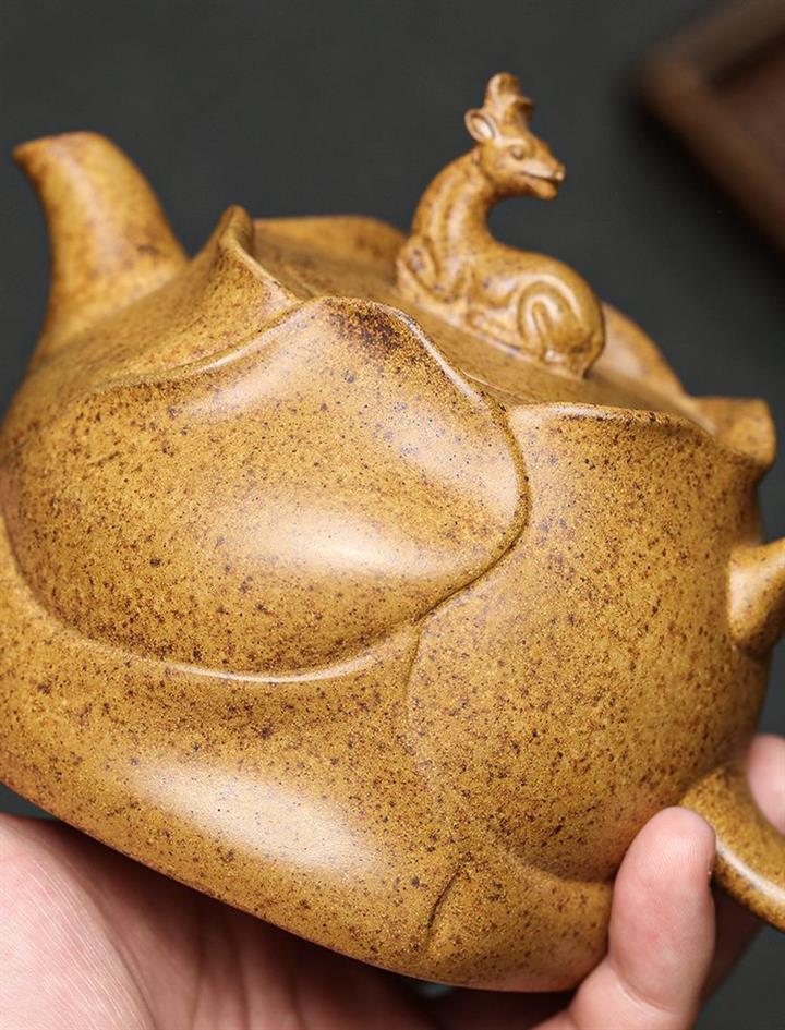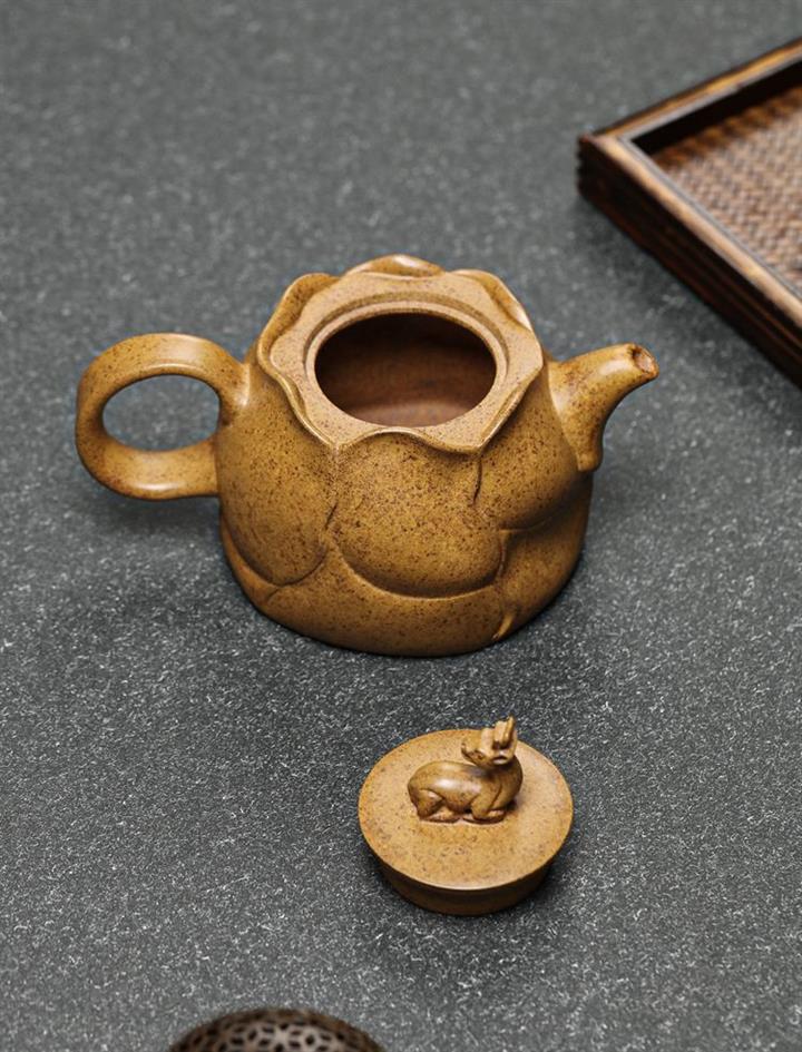 【介紹】此壺造型取風卷葵花之形狀,壺上的六瓣葵花均勻放開,既應物象形,又氣韻生動,仿佛能看到錦葵枝葉在大風中伸展卷曲,嬌嫩的花蕊在風中搖曳。壹鹿小尾低垂,雙耳後翹,以此爲壺鈕,精致美觀,寓意祥瑞