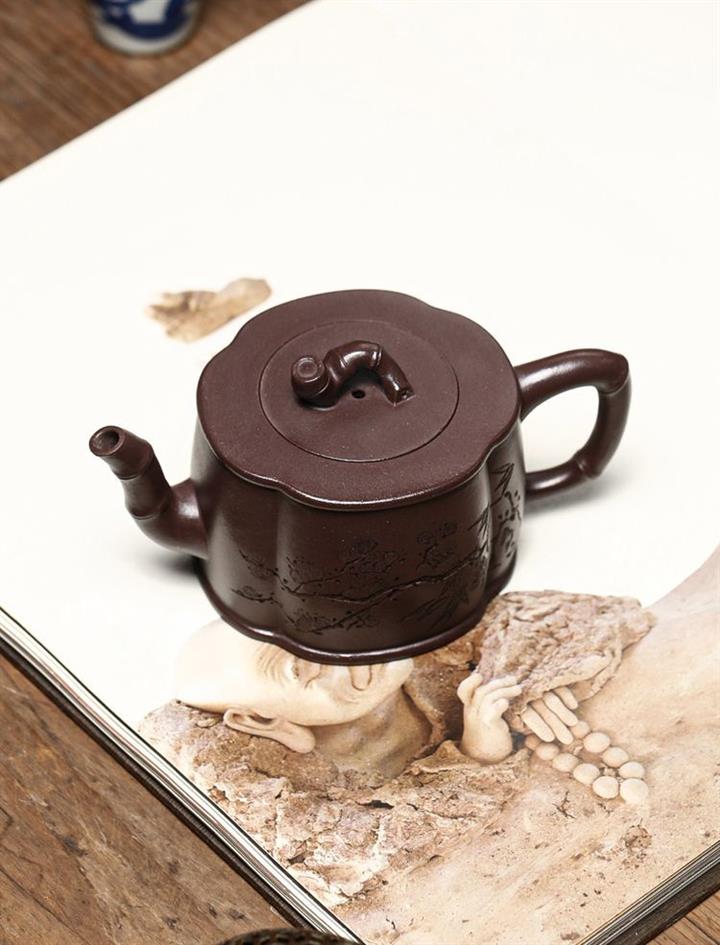 【介紹】此壺壺身如梅花花瓣,更襯托出此壺的莊重氣勢,古樸的色澤使該壺顯得格外寧靜,該壺壺身雙面精美刻繪,壺嘴、壺把皆為竹節為形,形象生動。壺鈕處以彎曲的竹節紋飾做裝飾,美觀精致