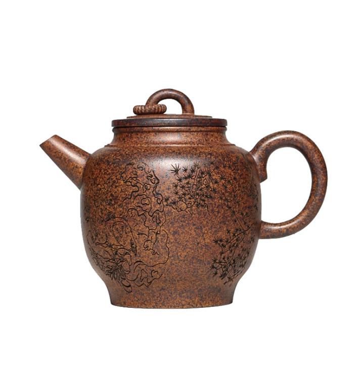 【介紹】此壺壺型圓融穩重,線條自然流暢。壺蓋壓蓋,半環鈕上塑以一圓環,設計巧妙雅致。直嘴出水,耳把比例和諧,提攜舒適。