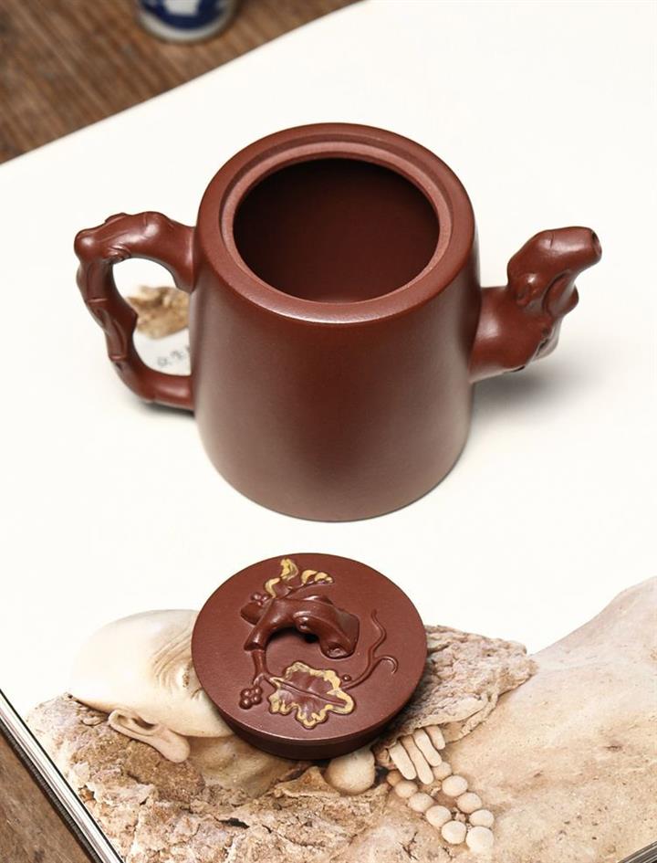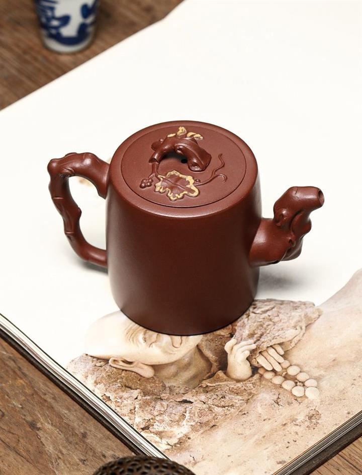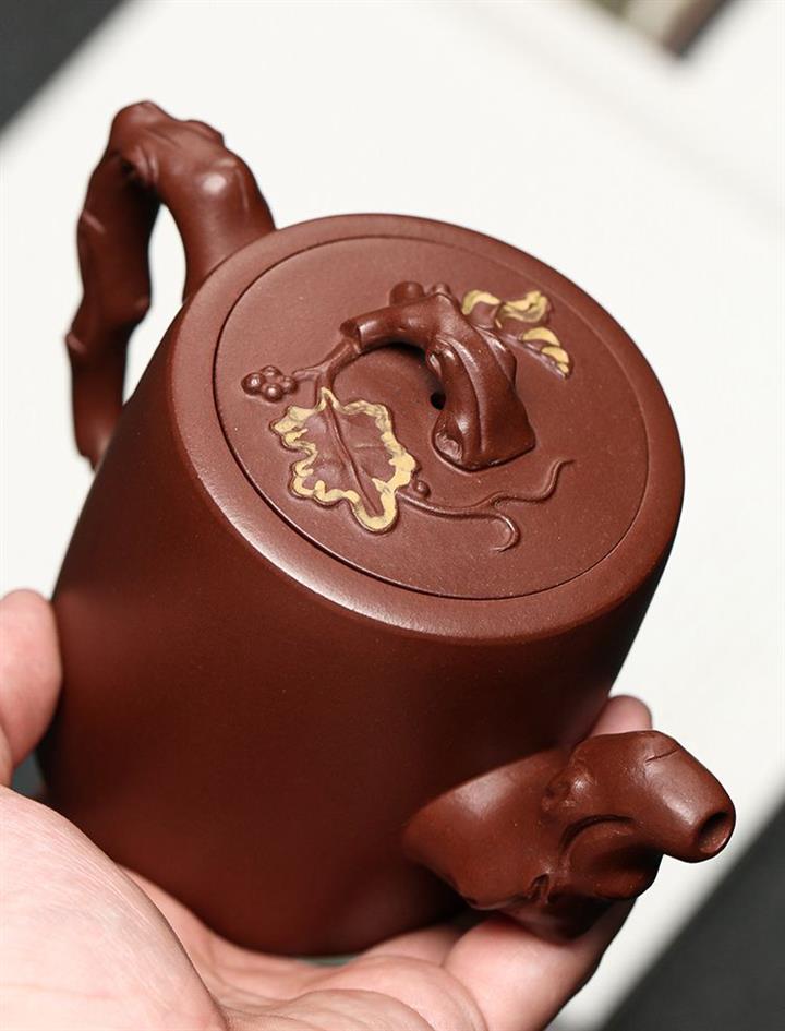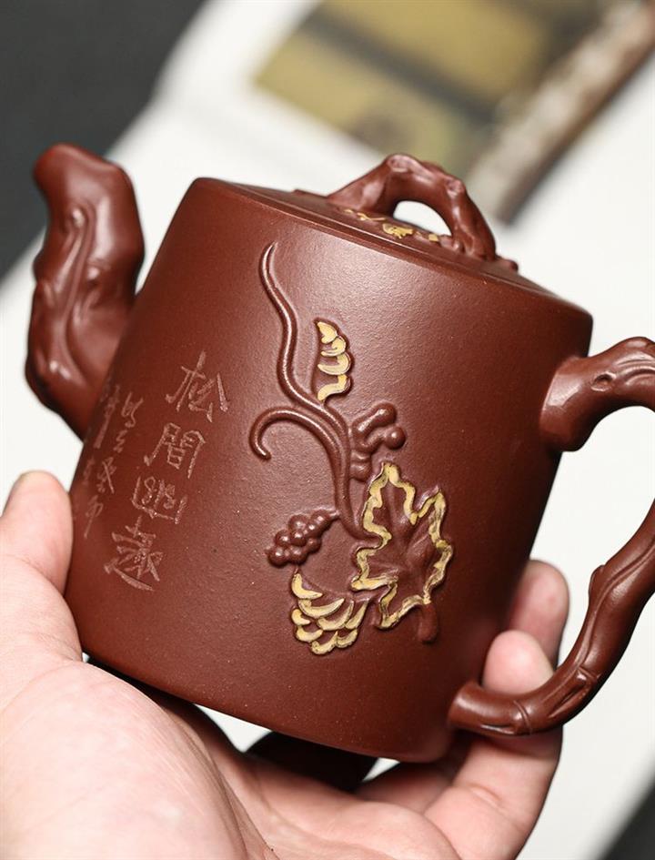 【介紹】此壺壺身飽滿圓潤,壺鈕折枝式,拿捏方便。壺蓋雕葡萄藤枝,果實飽滿。壺嘴、壺把仿枝幹造型,壺身有舒展葉片、卷曲細蔓、成串葡萄。整器做到了實用與藝術的結合。