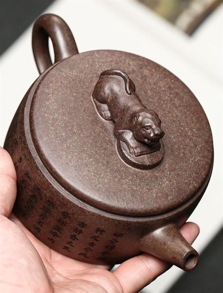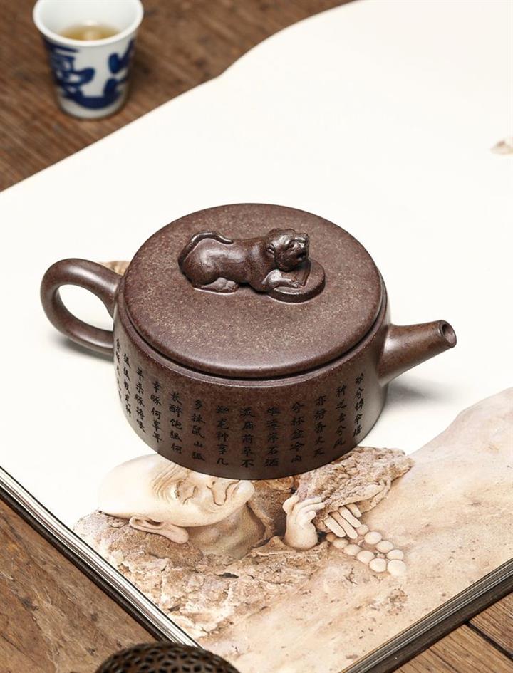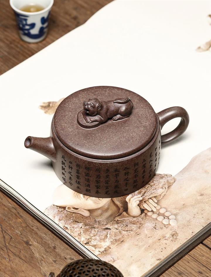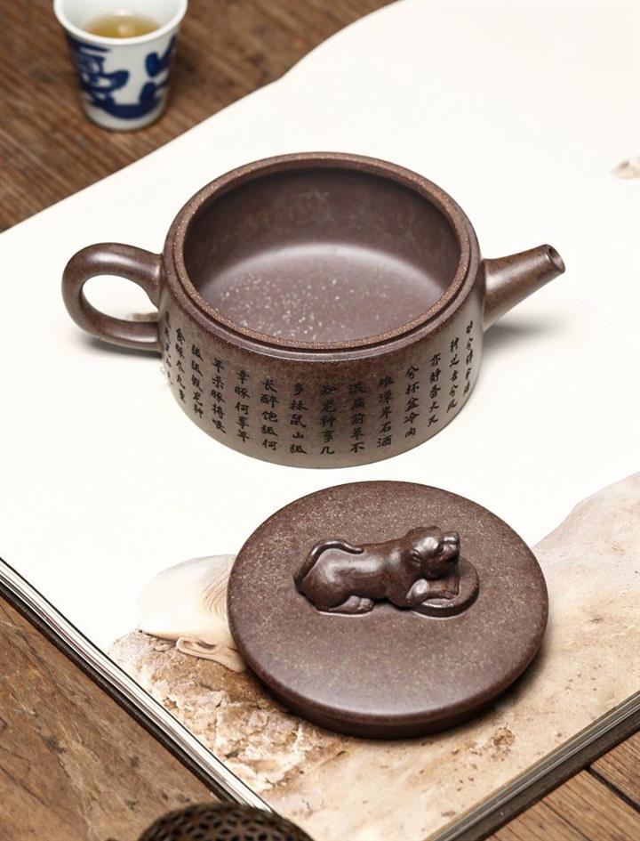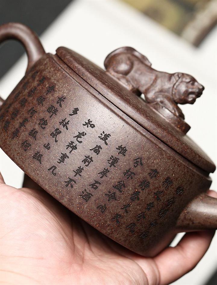 【介紹】此漢瓦壺古樸端莊,溫和典雅。身直而口大,平蓋板子母線吻合,很是闊朗大氣。獸鈕裝飾,更添古韻。壺身刻字壺底龍形刻繪裝飾,直嘴圓口,出水流暢,耳型端把,彎曲有度。漢瓦壺蘊含大氣素樸與大巧若拙的傳神壺韻,是眾多愛壺茶友幾案桌臺上必不可少的品茗兼屬把玩、觀賞、收藏之壺形