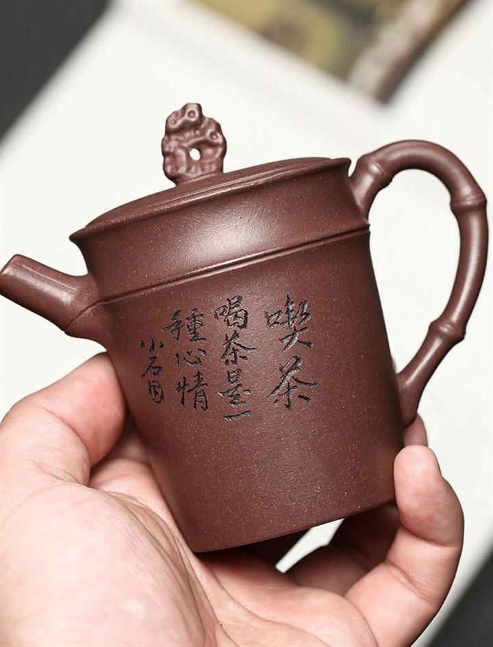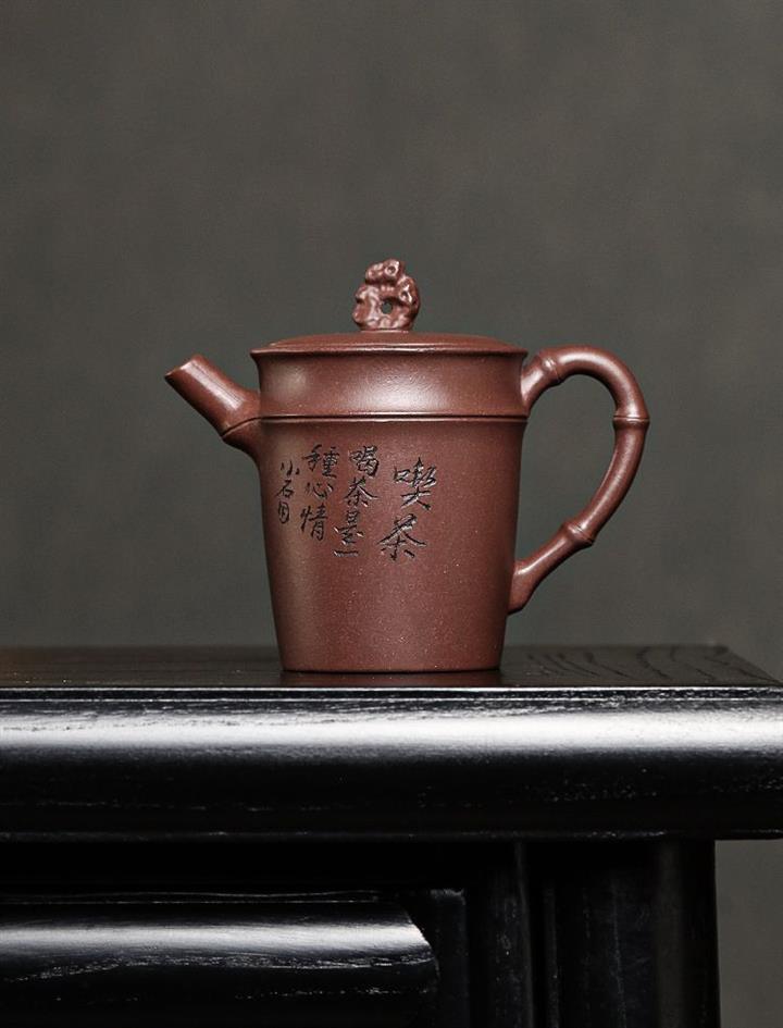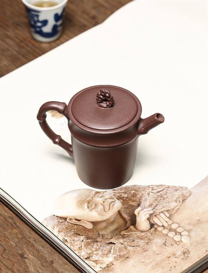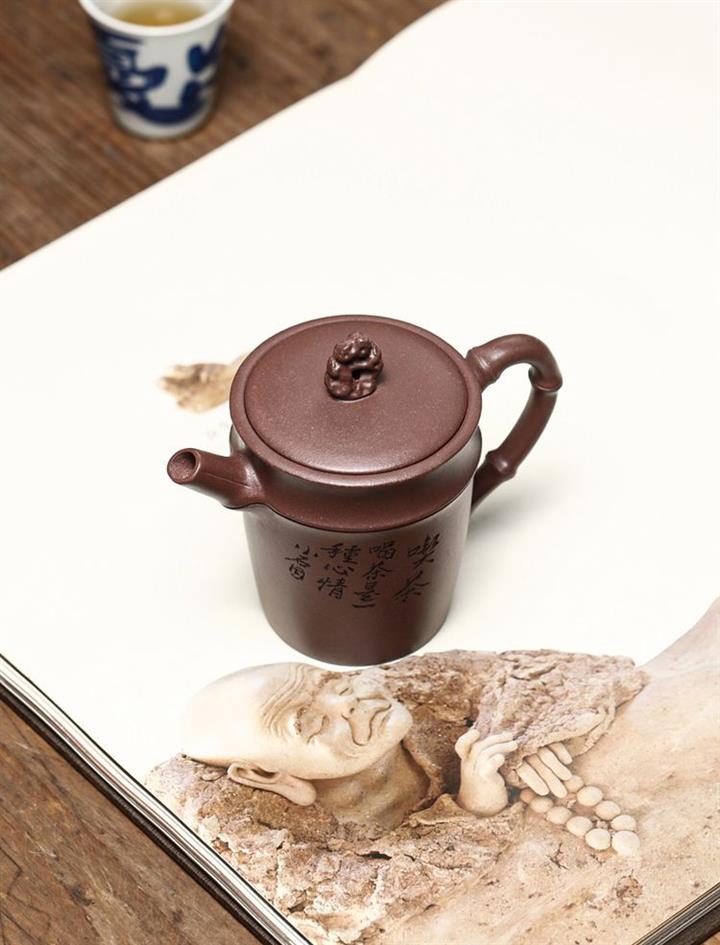 【介紹】製作工藝精湛。線條自然有力,其鈕更是點睛之作,以「太湖石」為形,嵌蓋上飾一小塊太湖石,猶如微型盆景中的假山褶皺自然,神韻俱佳,壺身圓柱狀,線條流暢,壺身精美刻繪,以竹節為壺身,壺嘴,壺把,直嘴圓口,出水順暢,耳把則更顯細膩自然,表現了紫砂茶器的簡潔素雅之美