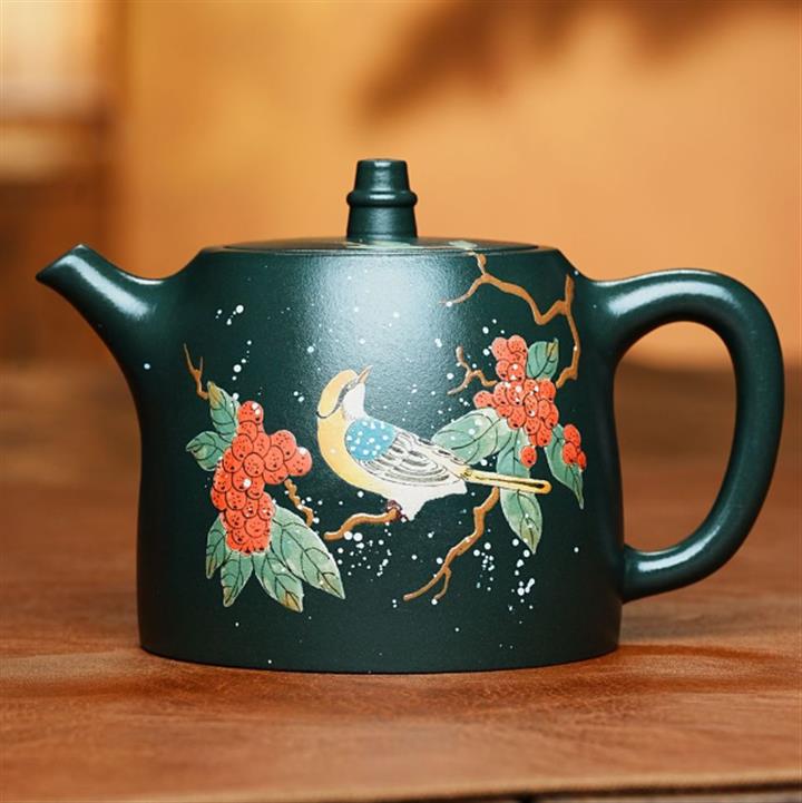 原礦綠泥漢鐸全手工泥繪小鳥紫砂壺POT6512