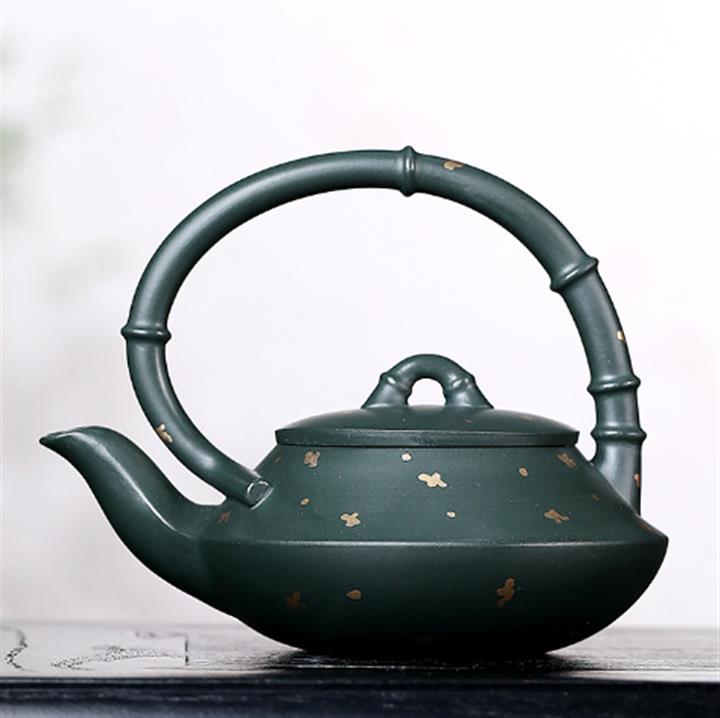 原礦綠泥手工灑金提梁竹節曲壺POT6514