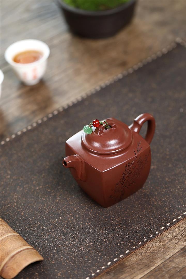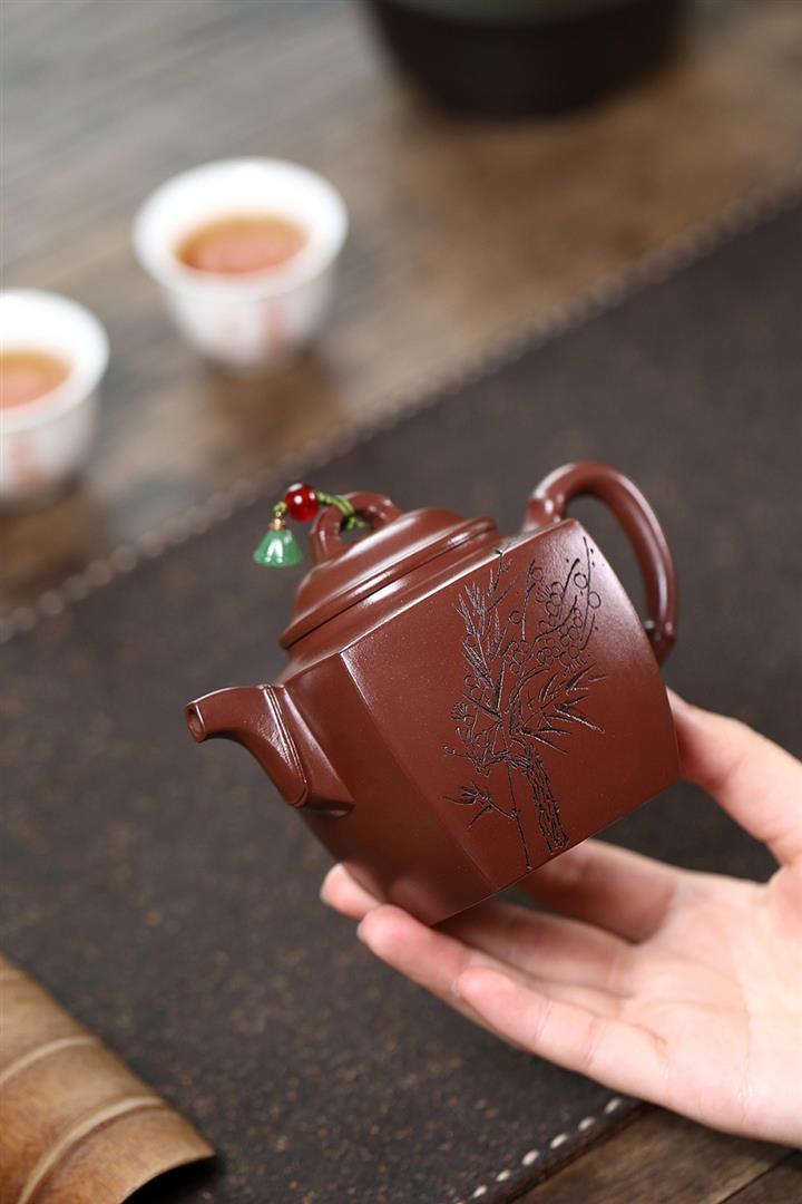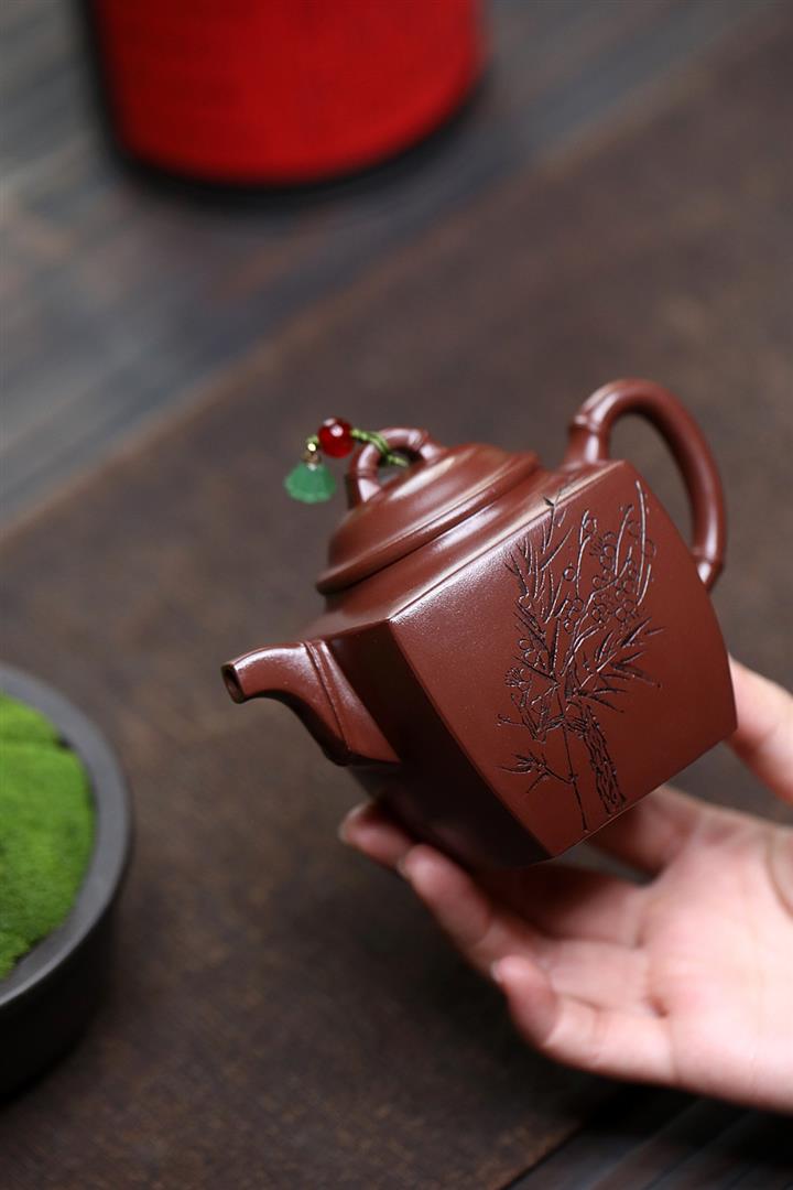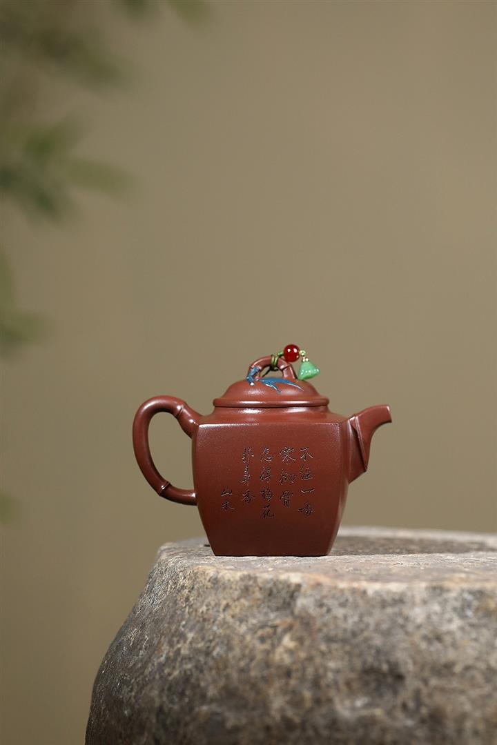 原礦赤金朱泥太湖石手工竹影漢瓦茶壺POT6566