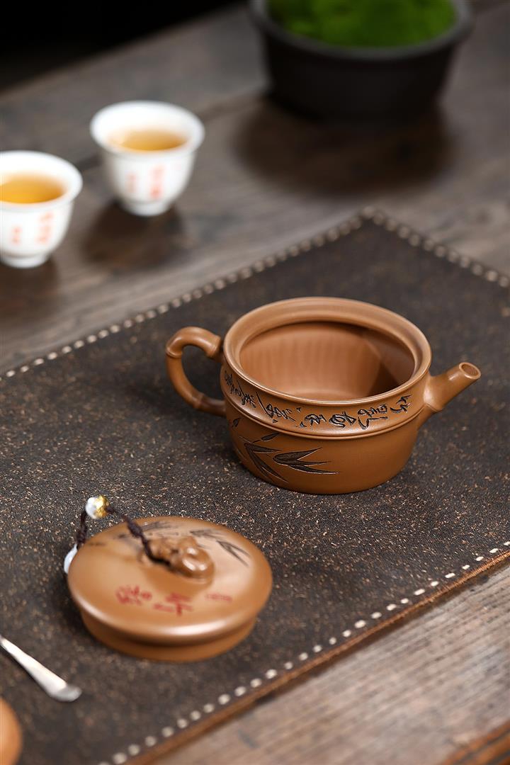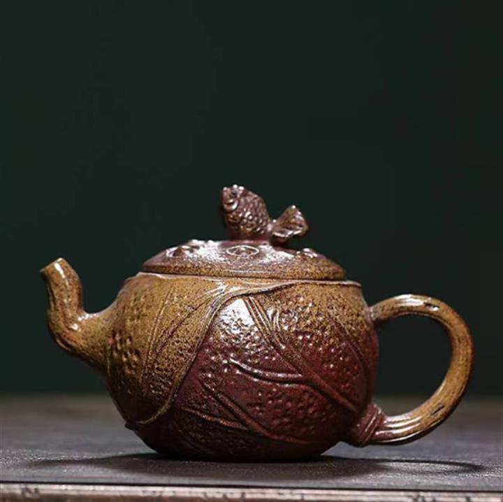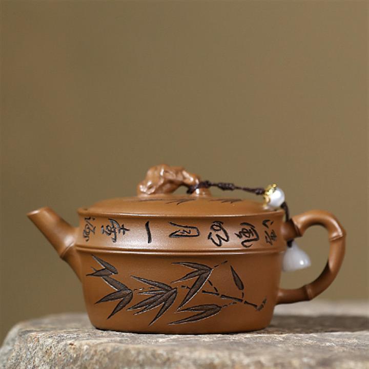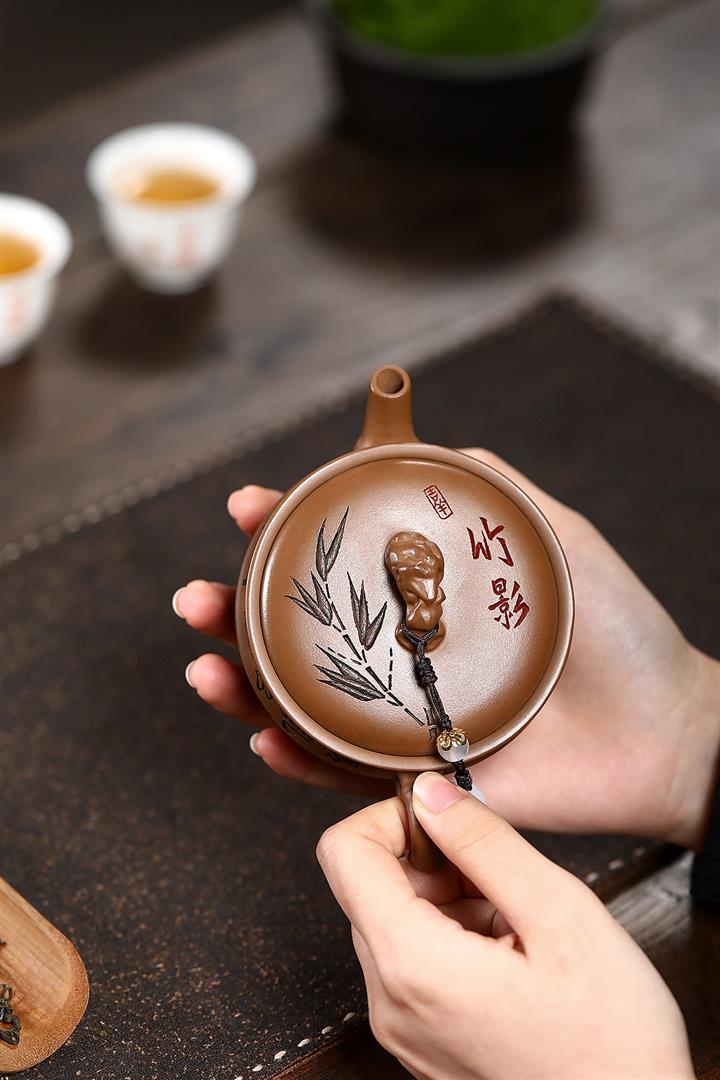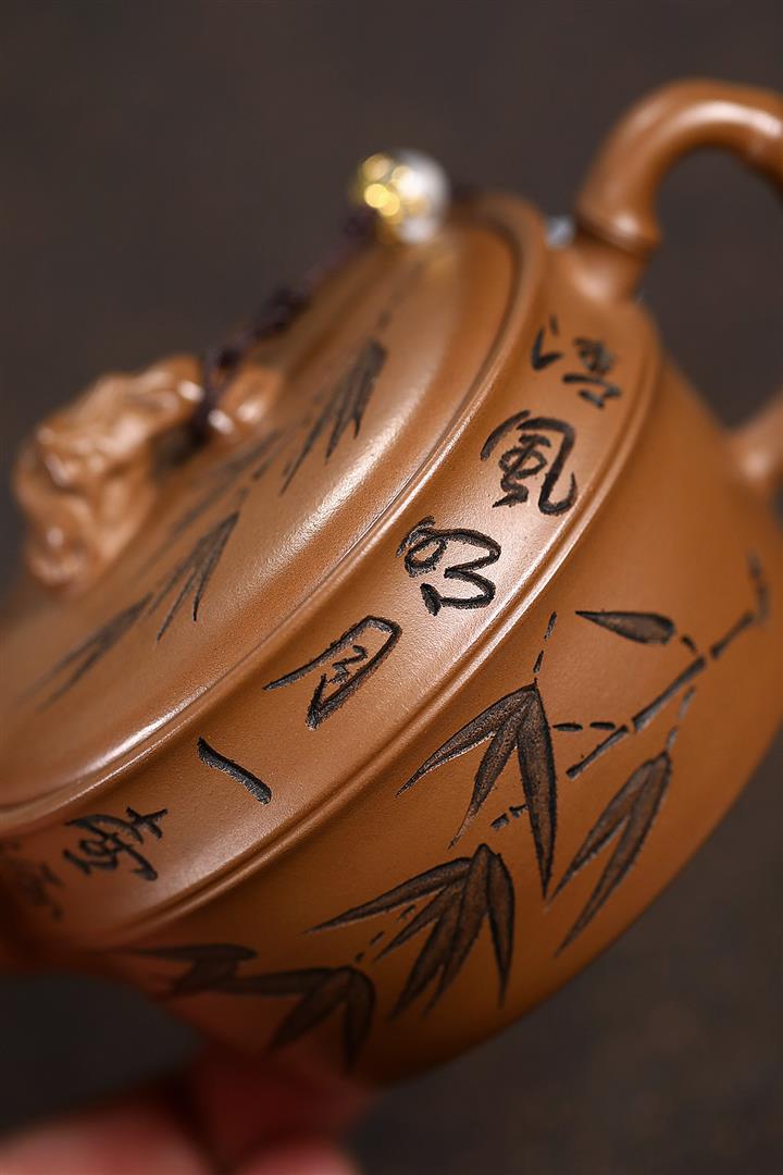原礦赤金朱泥太湖石手工竹影漢瓦茶壺POT6566