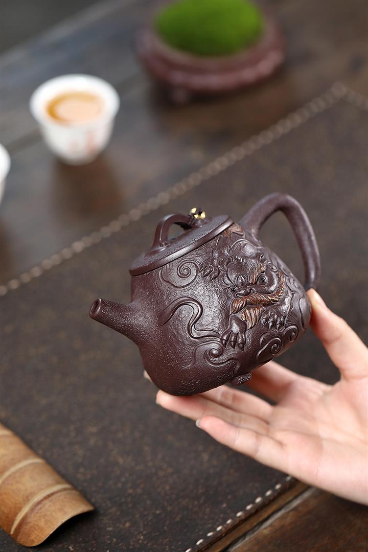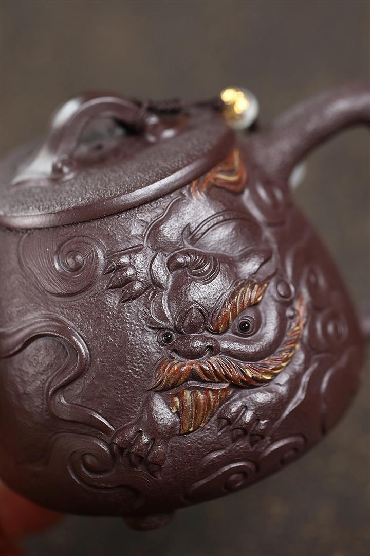 原礦老紫泥手工金獅繡球高石瓢壺POT6651