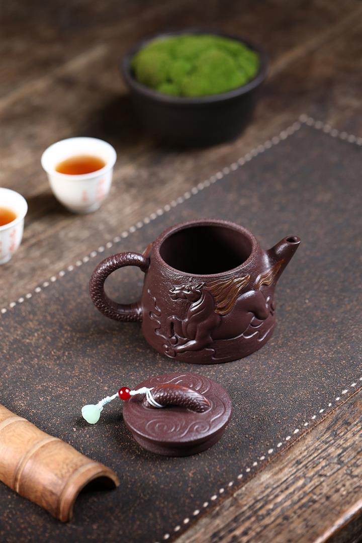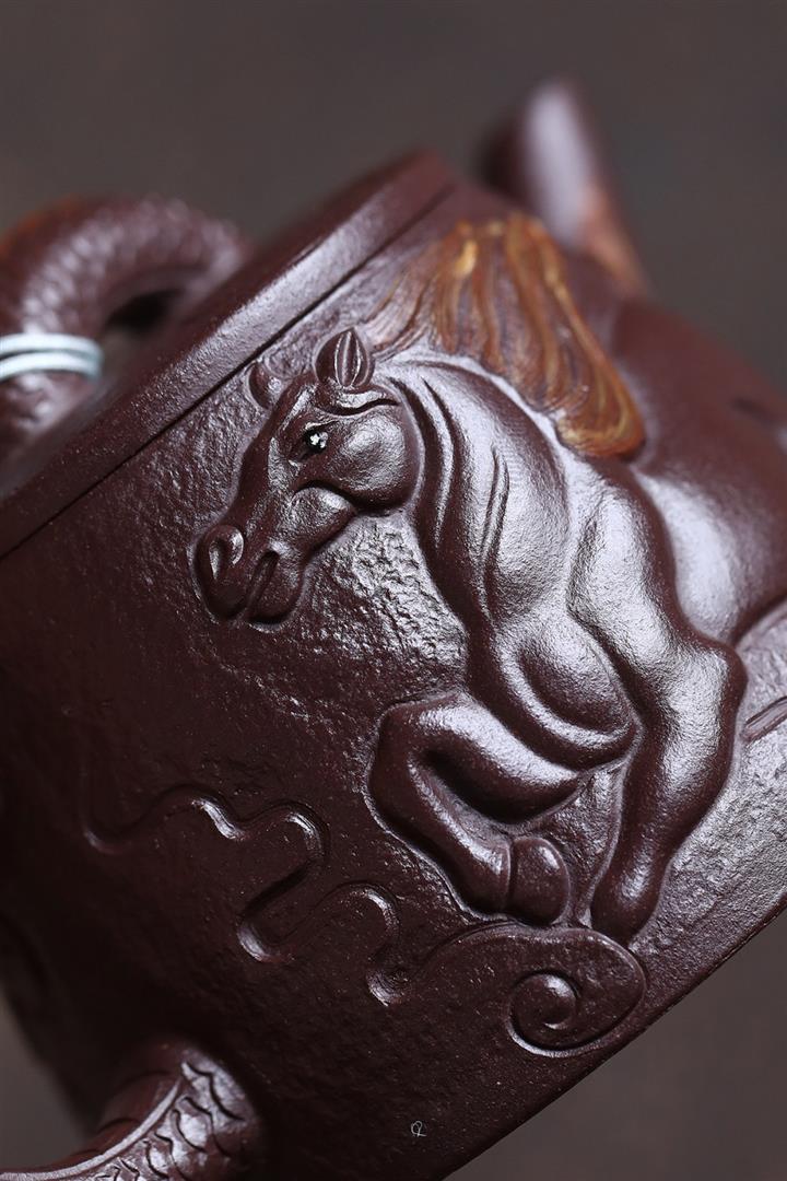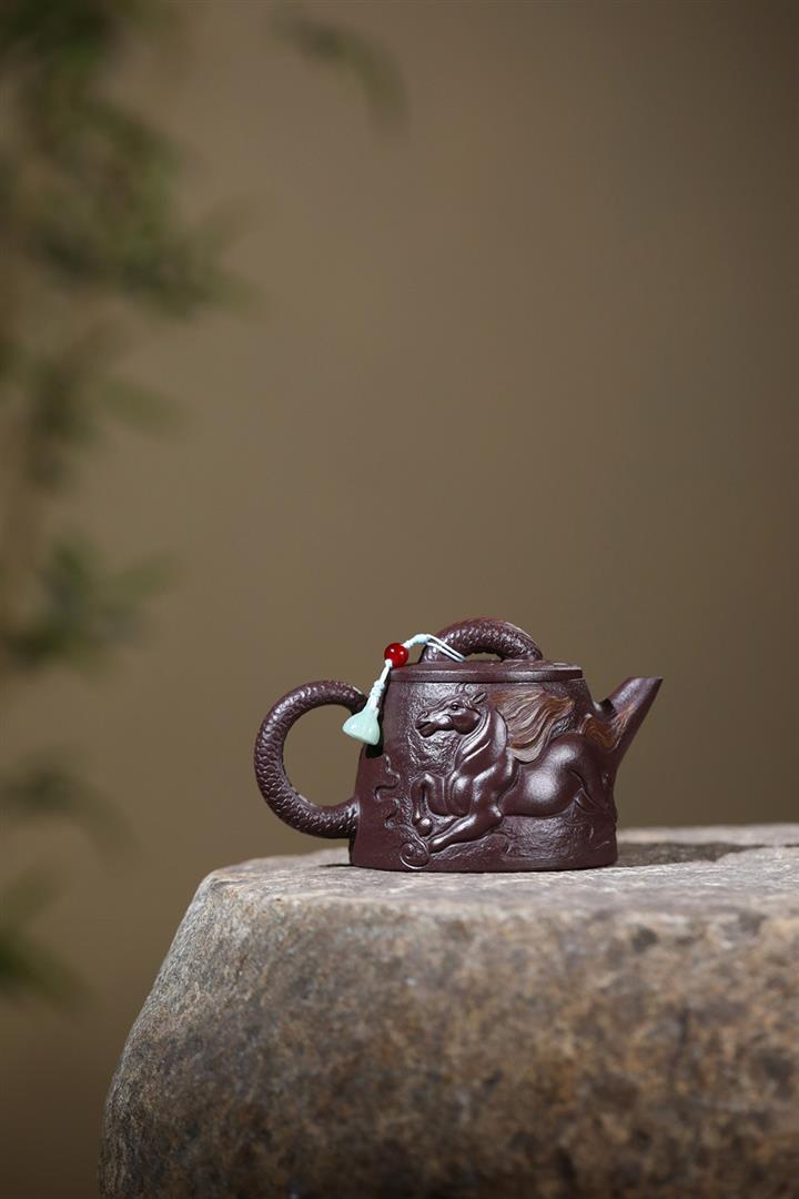 原礦紫泥手工刻字畫馬上封侯四方壺POT6737