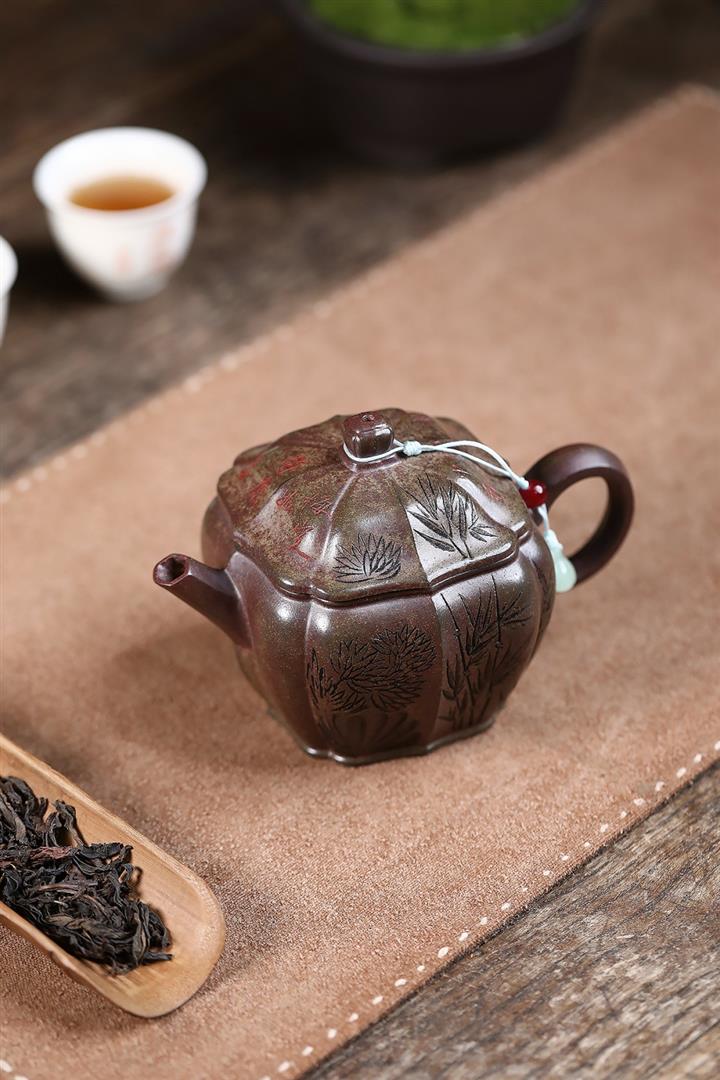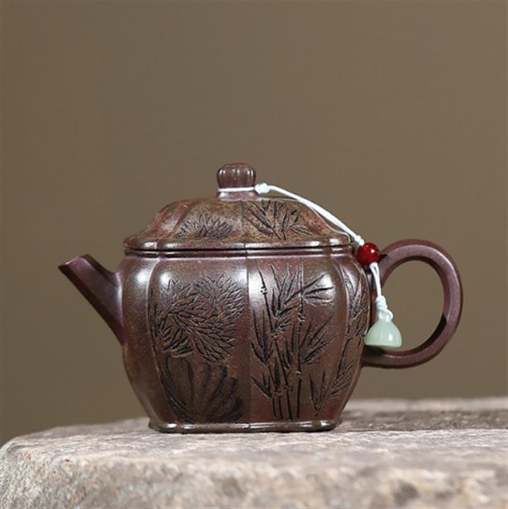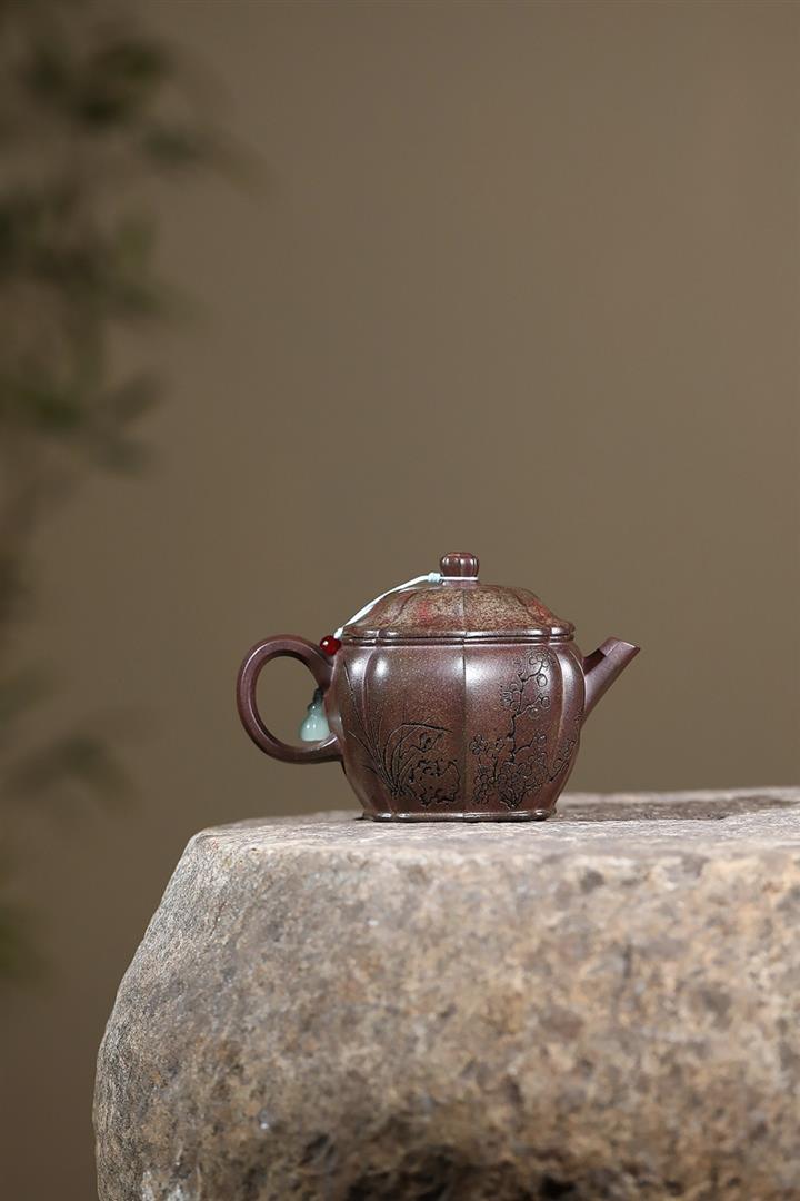 原礦紫泥手工刻字畫馬上封侯四方壺POT6737