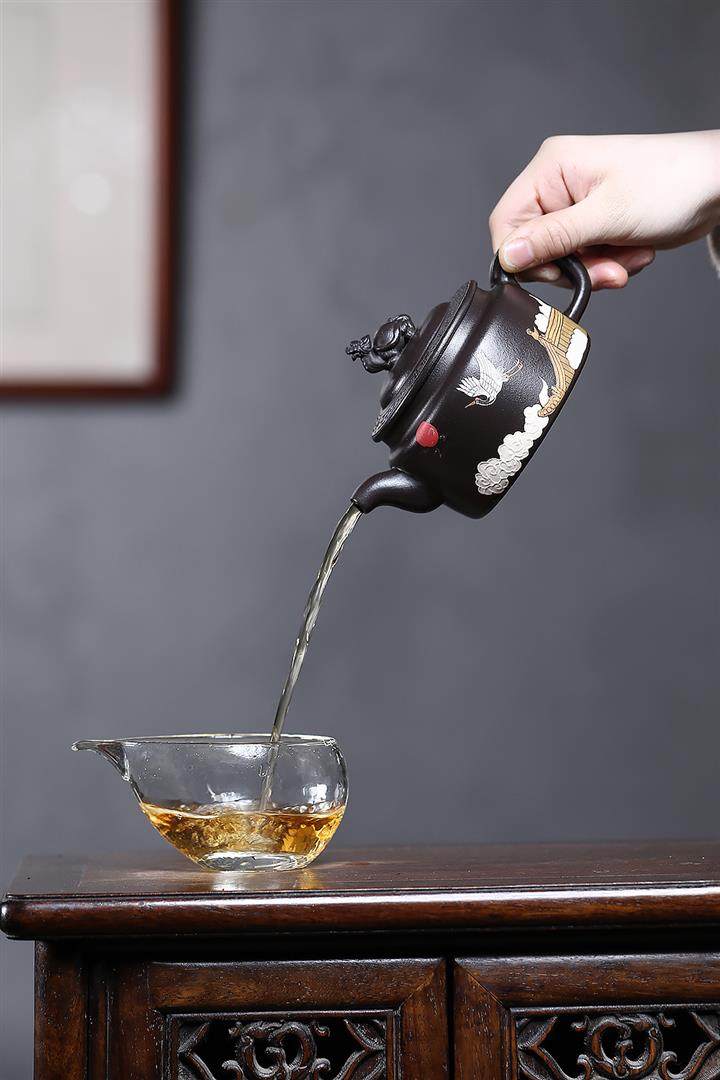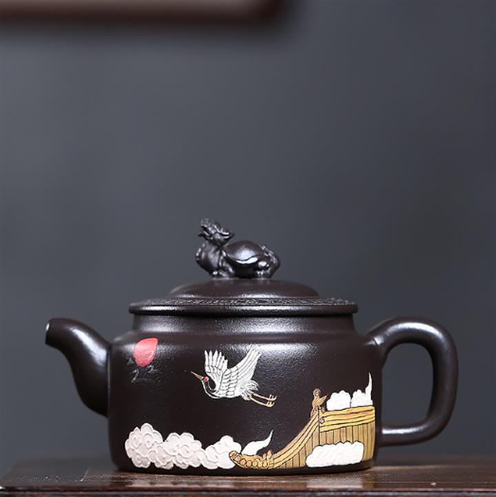 原礦黑泥彩繪仙鶴龍龜茶壺POT6832