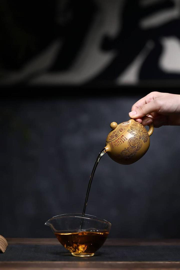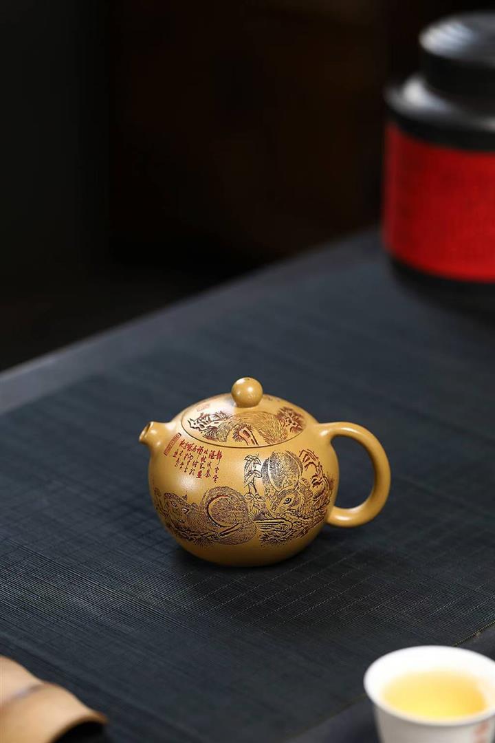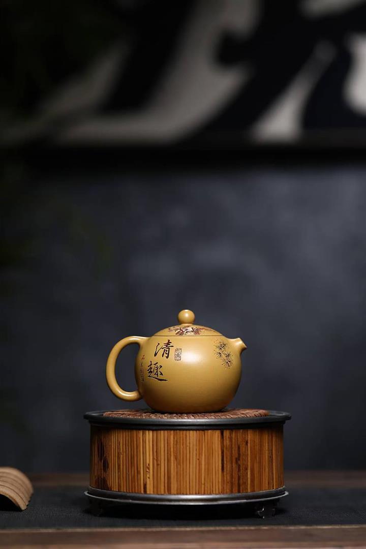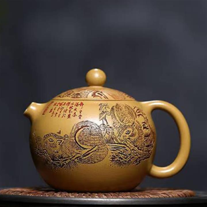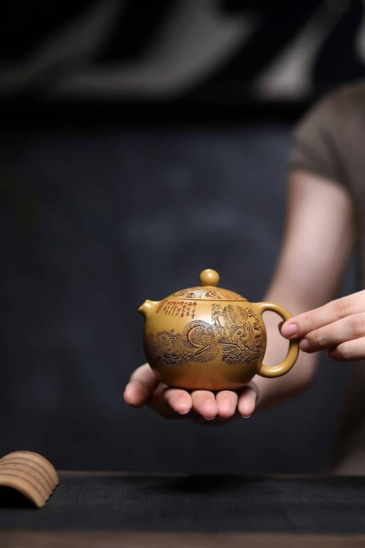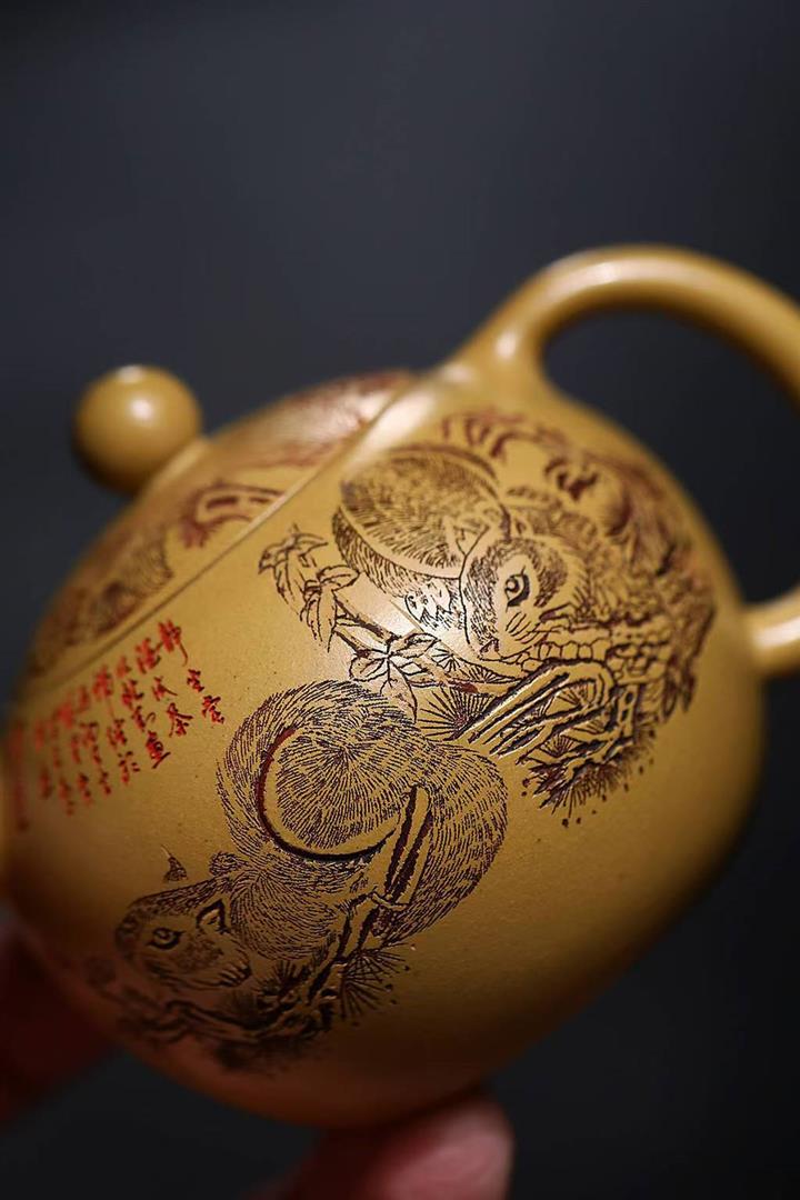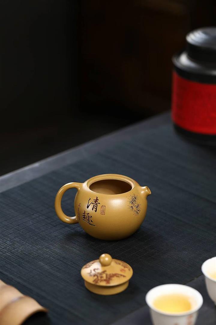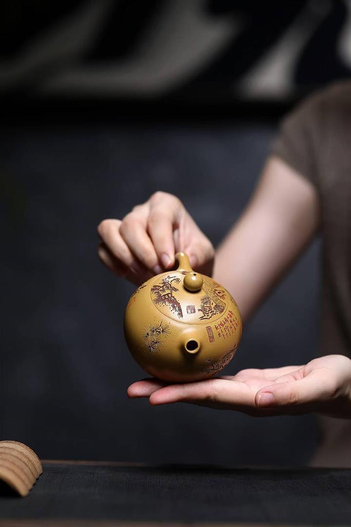 原礦石黃刻繪觀山汲直茶壺POT6981